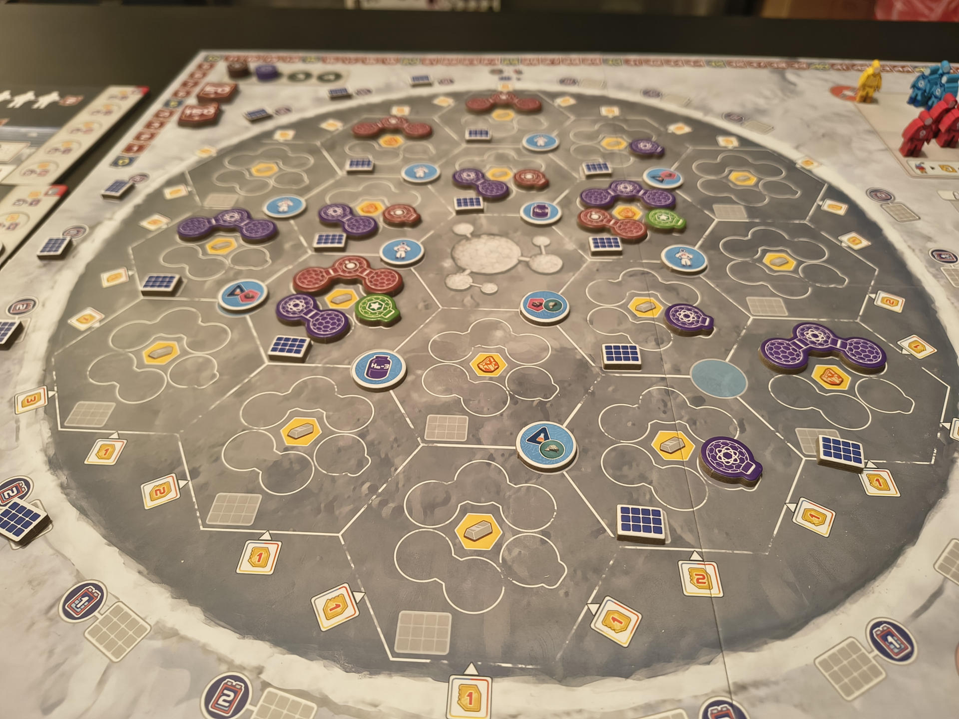 Und dann geht es auch schon los. Im Großen und Ganzen gibt es nur drei verschiedene Aktionen, die ein Spieler machen kann, die er durch das Einsetzen seiner Astronauten aktiviert: Auf dem Plan kann er entweder mit gelben Astronauten nach Bodenschätzen graben, die sich entlang eines gerade Pfades von seinem Startpunkt aus befinden. Jedes bebaute Hex wirft Ertrag ab, aber Achtung: Hat man auf diesem Hex selber nicht das größte Gebäude, muss man seinen Mitspieler bezahlen! Setzt man hingegen einen blauen Astronauten aus, erhält man die Ressourcen auf den blauen Firmen-Tokens an den Kreuzungen der Hexes. (Im Einführungsspiel sind dies Helium, Touristen-Astronauten oder Forschungstokens.) Setzt man jedoch einen roten Astronauten ein, bekommt man einfach nur Geld. Was auch hilfreich sein kann, wenn man mal wieder total pleite ist. So eine Mondbasis ist im Unterhalt nämlich recht teuer und so muss man nach jeder der Runden einen Upkeep/Maintenance zahlen, je nach Menge und Größe an Gebäuden, die man besitzt. Astronauten im Krater werden übrigens am Ende der Runde in die Basis einziehen - je nachdem, wer die Mehrheit an Gebäuden in dieser Reihe hat - und dadurch weitere Vorteile generieren! Etwa sind gelbe Astronauten im obersten Labor (den zweiteiligen Habitaten) gut, um die Wartungskosten zu verringern!