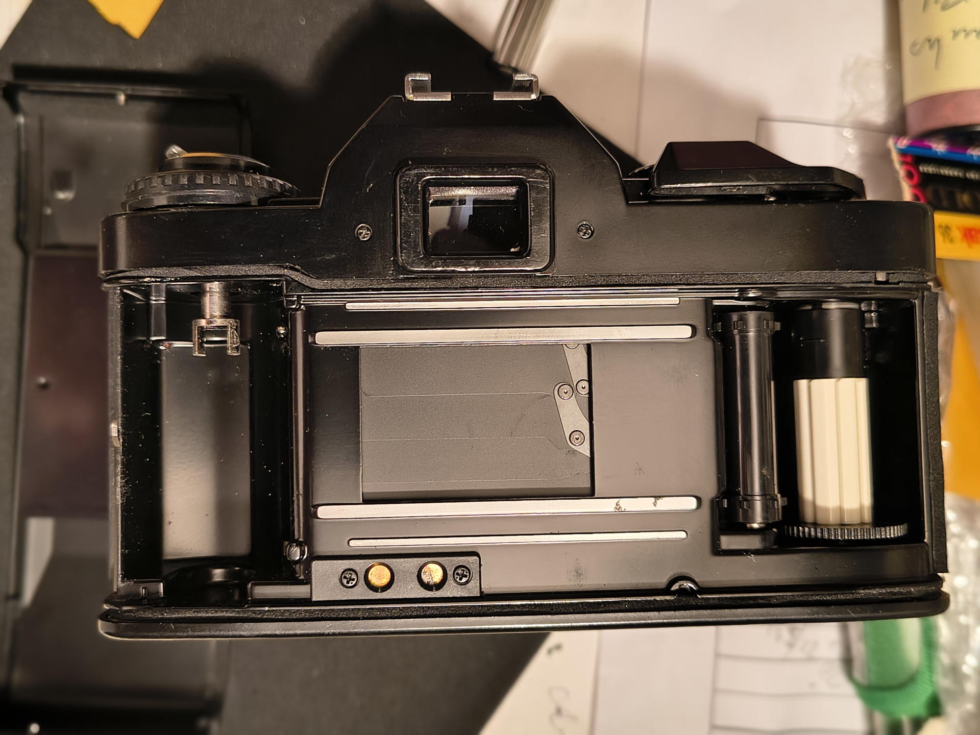 Dieser Austausch hat mir auch die Gelegenheit geboten, mich noch ein bisschen mit dem Innenleben der Kamera auseinanderzusetzen. Der Verschluss hat leider ein paar Kratzer, aber nichts, was in diesem Alter nicht sowieso üblich wäre. Außerdem konnte ich sie noch mal kräftig auspinseln und entstauben. Dementsprechend sind auch recht wenig Flecken auf den Test-Negativen die ich danach gemacht habe. Da habe ich schon ganz andere Kandidaten gesehen. In ihrem vorherigen Leben wurde diese Kamera offensichtlich gut behandelt. Oder zumindest nicht allzu schlecht!