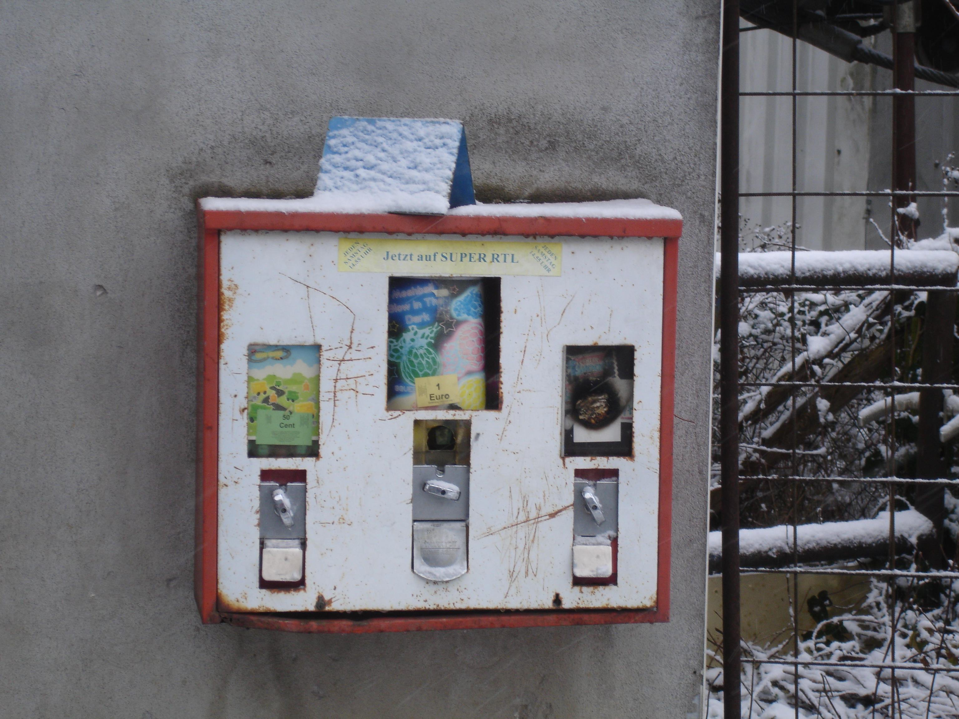 10.1.: Nachdem der Akku dann erfolgreich geladen war, habe ich die 20 Jahre alte Sony DSC-P200 dann mal mit in das Schneegestöber genommen, das da am Samstag vor der Tür abging. Die Reste vom Sturmtief "Elli" drehten sich ziemlich genau über uns und es kam so eine Mischung aus nassfeuchtem Schnee und noch nicht ganz aufgetautem Regen runter. Wobei ich noch Glück hatte, als ich unterwegs war: Das war alles mehr oder weniger fest und ist dementsprechend ganz gut an meiner Jacke runter gepurzelt, statt einzuziehen und mich zu frosten. Die Impregnierung ist ja auch nicht mehr so wahnsinnig an der roten North Face Jacke. Die ist schließlich genau so alt (ungefähr) wie diese Kamera, die ich hier an diesem Tag testen wollte.