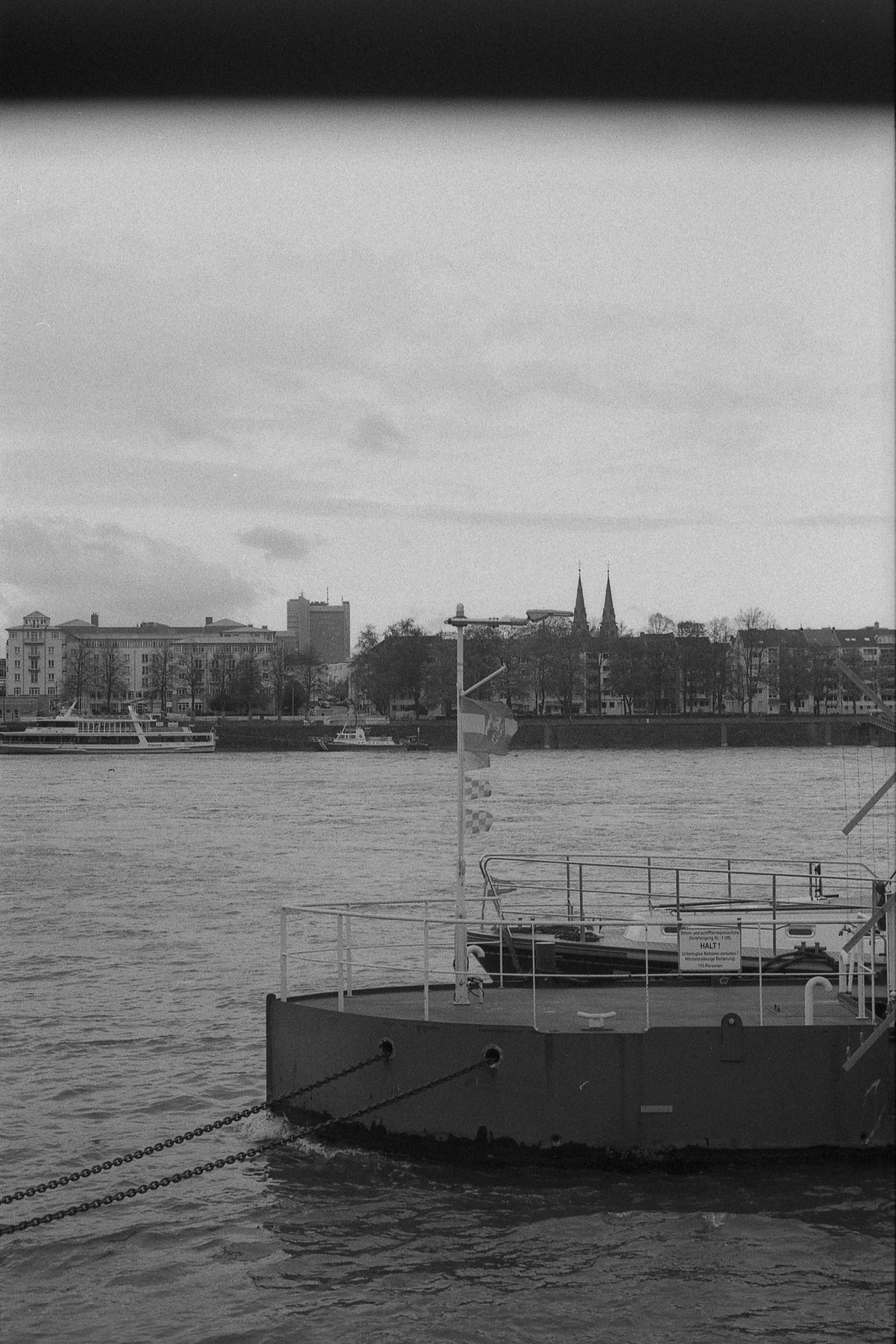 Am Anleger der Wasserschutzpolizei waren diverse Fahnen gehisst, die ich auch mal versucht habe, die im Rauschen des Films aber leider ein bisschen absaufen. (50mm, 1/1000s, f/6,7.) Was der schwarze Balken oben im Bild macht, weiß ich allerdings nicht. Habe ich da versucht, wie ich es immer mal wieder tue, mit dem Objektivdeckel das Gegenlicht ein bisschen abzublenden? Dafür ist es aber ein sehr gerader Streifen geworden. Muss also irgendwas anderes vor die Linse