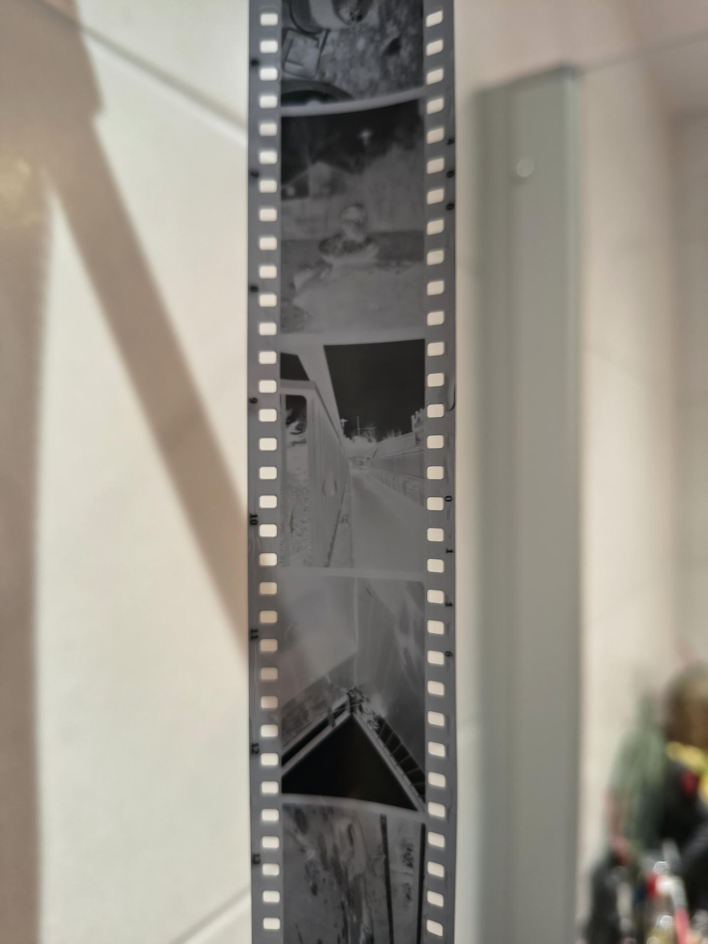 Raus gekommen sind auf jeden Fall Bilder. Ob die so schön grainy geworden sind, wie ich es mir erhoffe, konnte ich beim unter der Dusche trocknenden Film noch nicht feststellen. Ich brauche mal eine Lupe. Aber der erste Eindruck ist schon mal ganz gut. Aber ich glaube, die 11:30 Minuten bei 19,5°C und 1+25 waren doch noch immer ein bisschen zu kurz. Ich hätte es gerne noch knallig-knackigeren Kontrast gehabt. Noch ein bisschen dichter, um die Highlights so richtig poppen zu lassen! Aber ich glaube, man sollte den Foma auch nicht allzu sehr triezen, der ist ja nicht der am besten pushbare Film in meinem Kühlschrank.