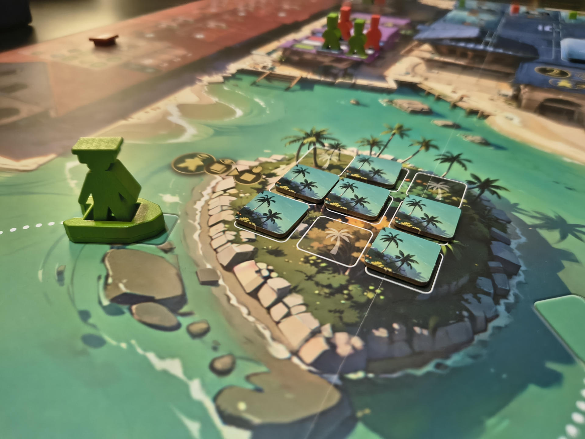 Ansonsten unterteilt sich das Spiel in 3x3 Aktions-Phasen, in denen man seine Arbeiter los schicken kann, um den Laden am Laufen zu halten und Einnahmen zu generieren, bzw. neue Ausrüstung anzuschaffen oder zu entwickeln, mehr Arbeiter anzuheuern, Schatzkarten auf dem Flohmarkt zu erwerben, oder auch, um mit dem einen Boot, das man am Anfang hat, auf See zu fahren und dort Schätze zu suchen, auf der Insel den Metalldetektor anzuwerfen, Touristen zu bespaßen oder einfach nur Thunfische zu angeln. Wenn man absolut keine Verwendung für seine Mitarbeiter hat, schickt man sie in die Muschelfarm, dann generieren sie wenigstens so viel Einkommen, dass man sie am Ende auch bezahlen kann. Das ist nämlich eine weitere Sache, mit der man sich als Kleinunternehmer wie im echten Leben konfrontiert sieht: Diese schrecklichen Mitarbeiter wollen auch noch bezahlt werden. Wichtig ist übrigens: Wenn man seinen Arbeiter zusammen mit dem Chef in eine Warteschlange einreiht, kann dieser wertvolle Kenntnisse erhalten (symbolisiert durch die Mütze, die er dann aufgesetzt bekommt) und von nun an auch den Chef-Bonus in diesem Gebäude abgreifen! Denn, wie schon angedeutet: Der Chef ist ein Experte auf jedem Gebiet und es ist immer wichtig, den Azubis auch was beizubringen!