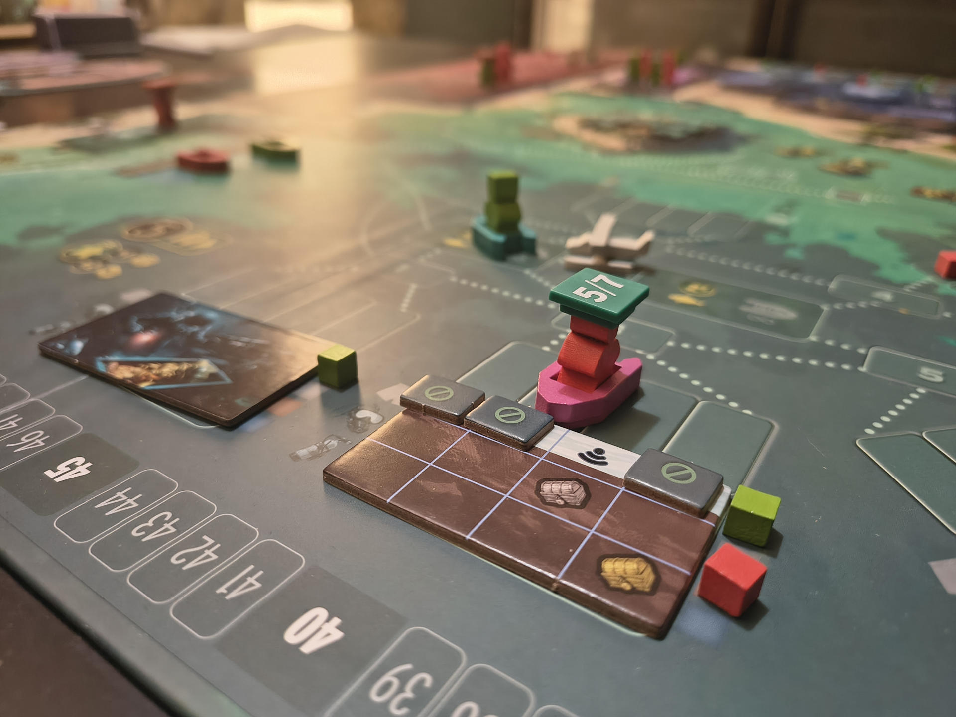 Was macht des Spiel jetzt anders als andere Worker Placement Spiele? Durch die unterschiedlichen, in jeder Rund aufgedeckten Karten im Technologie-Gebäude sowie die zufälligen Schatzkarten wird das Spiel dynamischer, als wären diese Elemente statisch. Zum anderen ist die Konkurrenz untereinander recht hoch, denn wenn eine Warteschlange voll ist, kann man diese Aktion in dieser Runde nicht mehr machen. Auch im Museum herrscht starker Konkurrenzdruck. Dabei wird es aber nie wirklich frustrierend schwierig. Die verdeckte Auktion um die Starspieler-Position erhöht den Nervenkitzel zusätzlich noch ein bisschen. (Ich habe dieses Spiel bisher aber nur im Zwei-Spieler-Modus gespielt, vielleicht erhöht sich der Konkurrenzdruck mit 3 oder 4 noch mehr und es kippt. Da es aber eine Rückseite des Spielplans für 3+4 Spieler gibt, denke ich mal, dass diese Modi entsprechend angepasst sind, dass es auch hier nicht zu allzu hohem Frust kommt.)