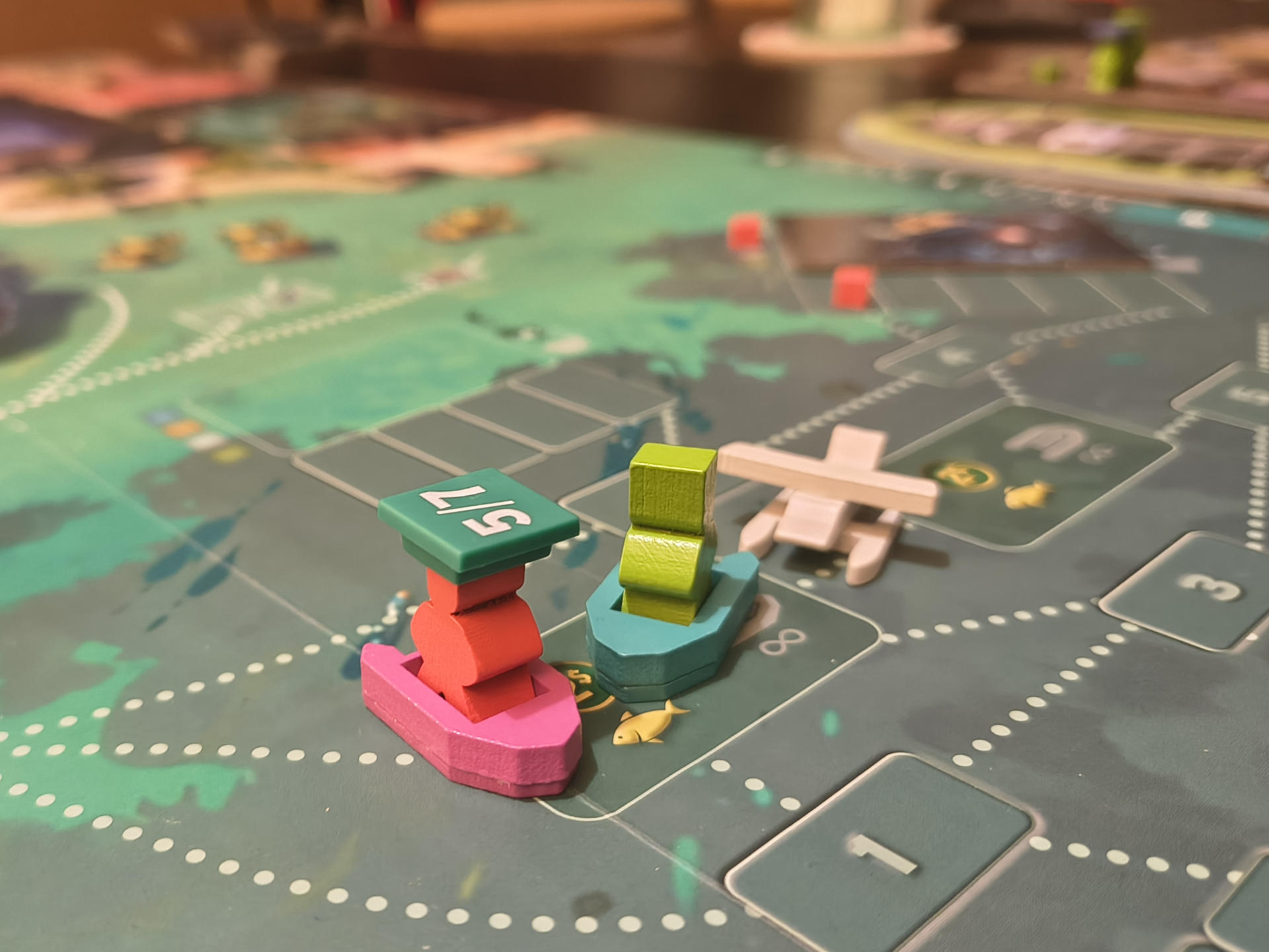 Das Alter der Spieler sollte hier - wie bei den meisten komplexeren WP-Spielen - schon ein bisschen höher angesetzt werden, ich sag mal, 12-14 sollten die Blagen schon sein. (Die Kiste sagt sogar "ab 14". Kommt halt auf die Blagen an.) Die Anleitung ist lang und ausführlich, klar strukturiert und durchdacht. Was ganz gut ist: Die englische Anleitung liegt auch in der Kiste und so kann man hier hin und her wechseln, wenn man etwas nicht klar sein sollte oder undeutlich formuliert ist. (Lost in translation passiert halt auch schon mal selbst den Profis beim Übersetzen von Betriebsanleituungen!) Ansonsten hilft das Internet. Das Spielmaterial ist hübsch designt, die Spielfiguren alle aus Holz: Gut. Für den Preis erhält man also ein durchdachte und interessantes Spiel. Es gab wohl Leute, die in den einschlägigen Foren darüber lamentiert haben, dass man die Haie/Fische/Hummer killen kann/muss, das Spiel ist also scheinbar nichts für Veganer!