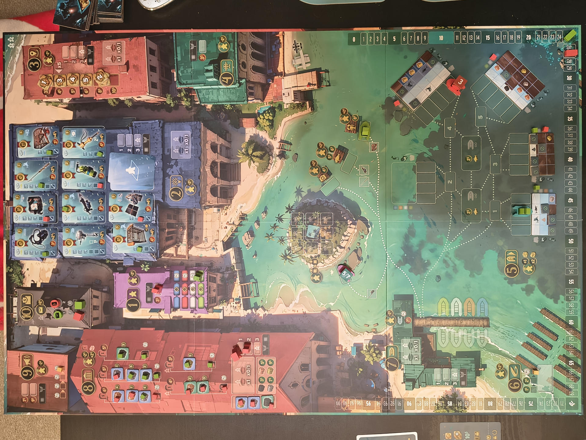 Heute mal wieder ein Spiele-Review: Thesauros (Griechisch für "Schatz")! Schon wieder so ein langes Spiel aus der Worker-Placement-Richtung. Das Setting: Irgendwo am Meer (warm, sonnig, mediterran) hat man sowas wie ein Bergungsunternehmen und kann mit seinen Schlauchbooten aufs Meer fahren, um dort Schätze zu heben oder alternativ auch die Touristen zu bespaßen. An Land kann man dann noch diverse Fähigkeiten und Ausrüstung ausbauen, sowie die lokalen Behörden bestechen. Also alles ganz normal, soweit.