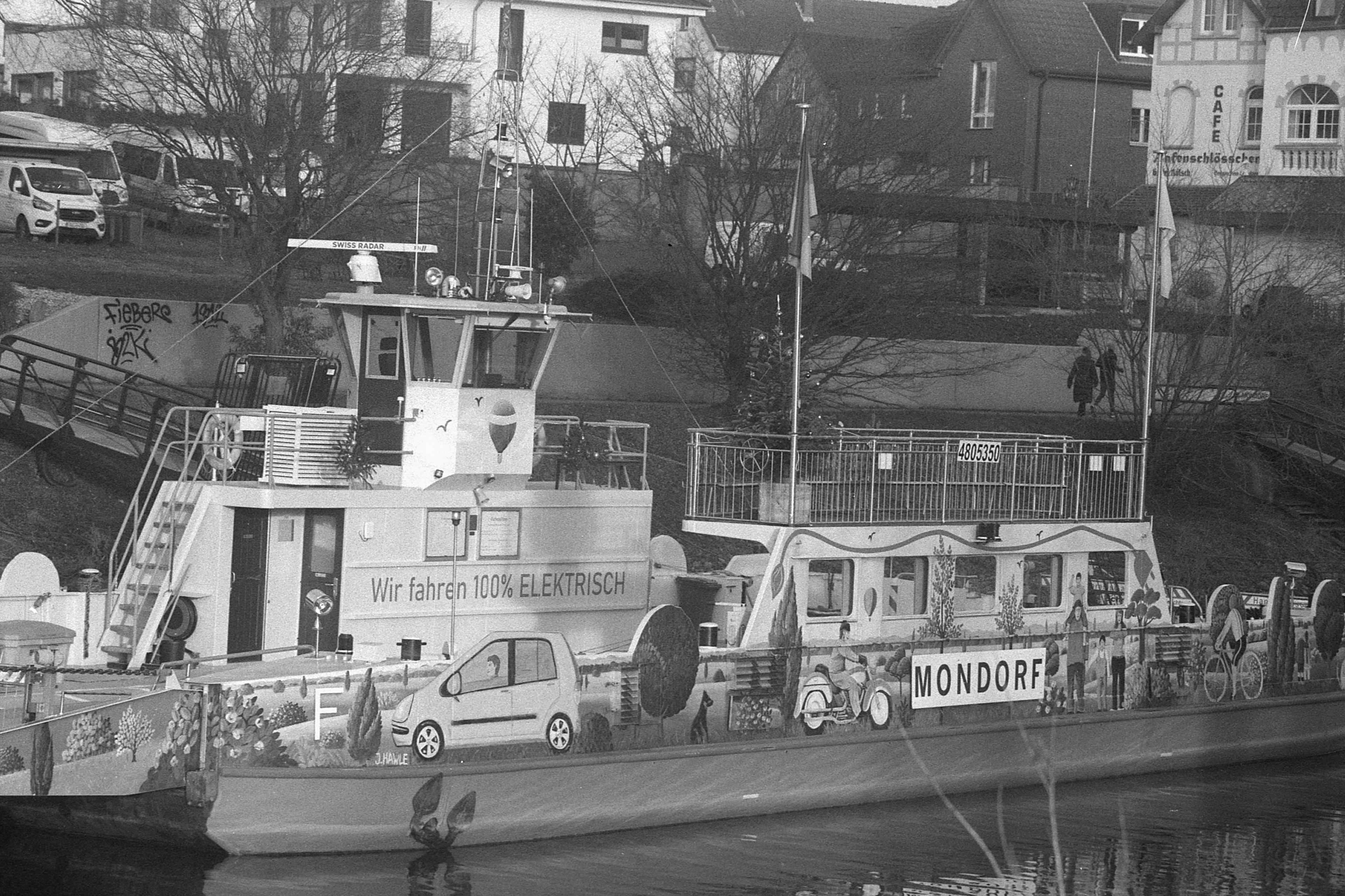 Dann lieber die fröhlich gestaltete Mondorfer Fähre? (1/500s, f/8, ~120mm.) Vielleicht versöhnt das dann wieder? Wie sie da so in der Sonne angebunden liegt und 100% elektrisch nicht fährt, weil Wochenende ist?