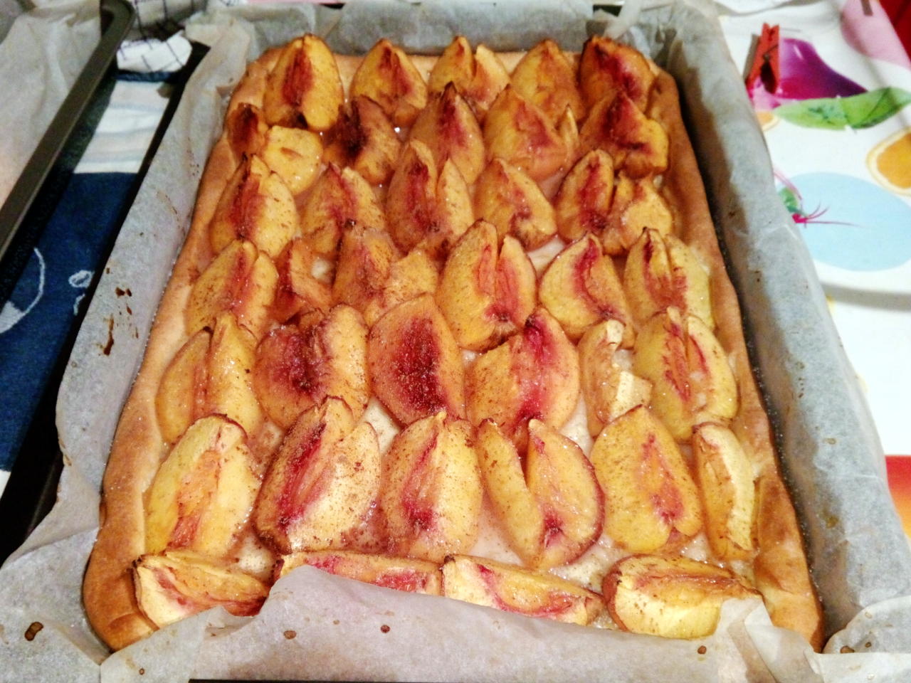 Heute den voraussichtlich endgültig letzten Pfirsichkuchen des Jahres gemacht. Der Baum ist fast abgeerntet und die restlichen werden wohl die Vögel und Wespen fressen. Es war jetzt schon schwierig, die beiden Platten hier komplett zu belegen.
