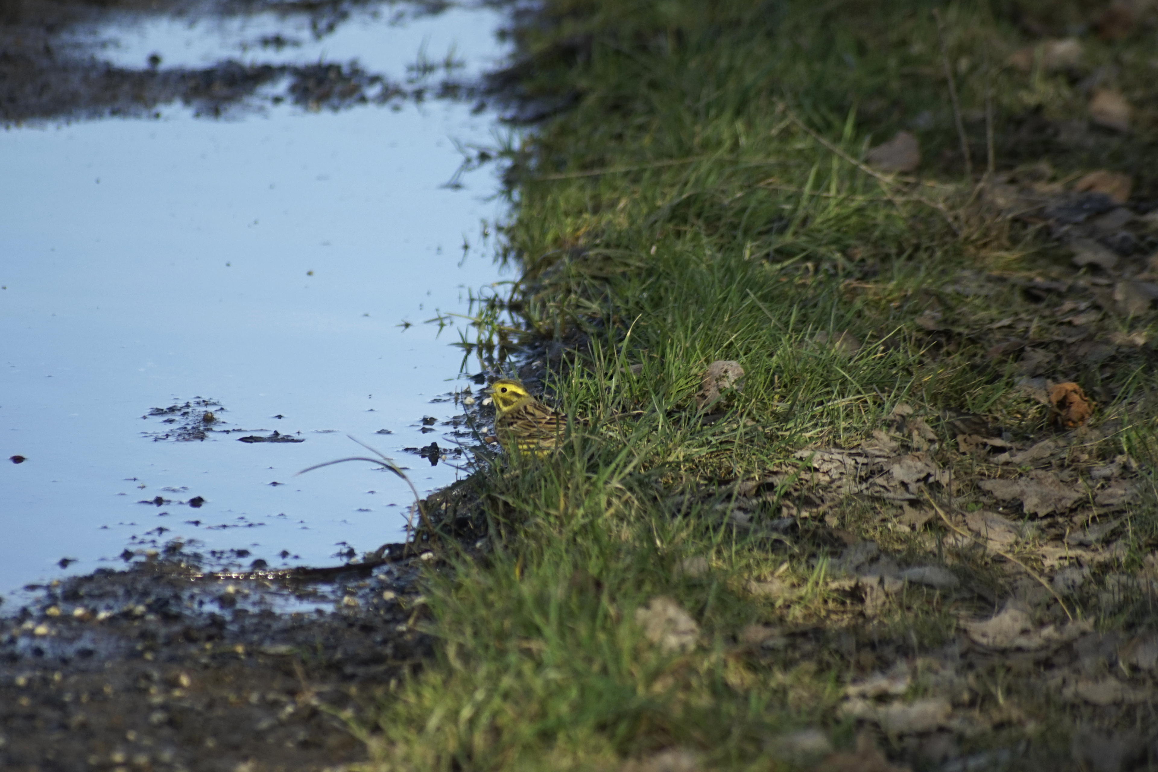 Auf dem Weg dahin saß jedenfalls plötzlich ein kleines, gelb-grünes Vögelchen an der Pfütze und war dabei, einen Schluck Wasser nach dem anderen zu nehmen. Sehr sehr niedlich. Und hier im Crop aus der Bildmitte auch sehr gut zu erkennen. Das Objektiv macht also durchaus gute Bilder!