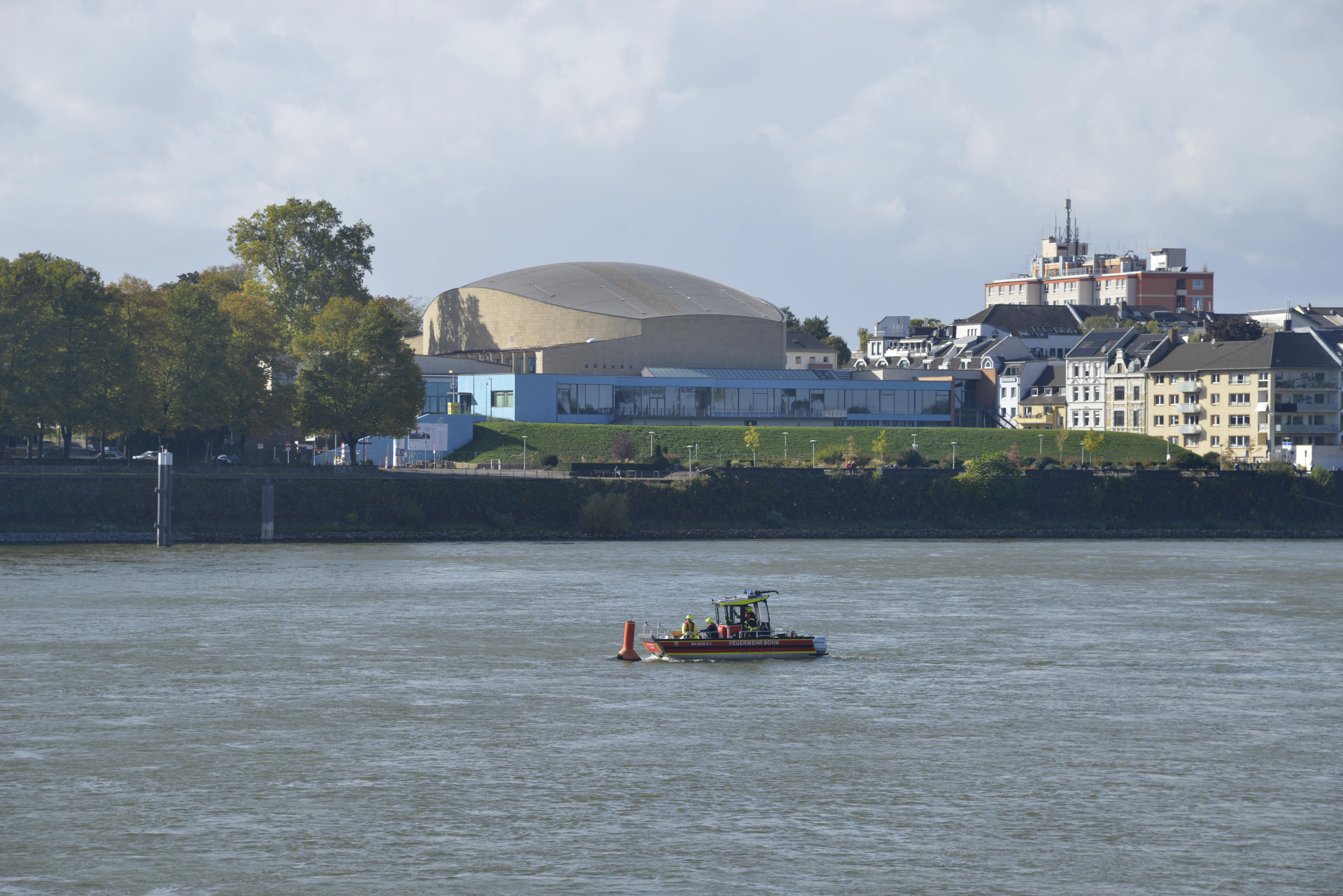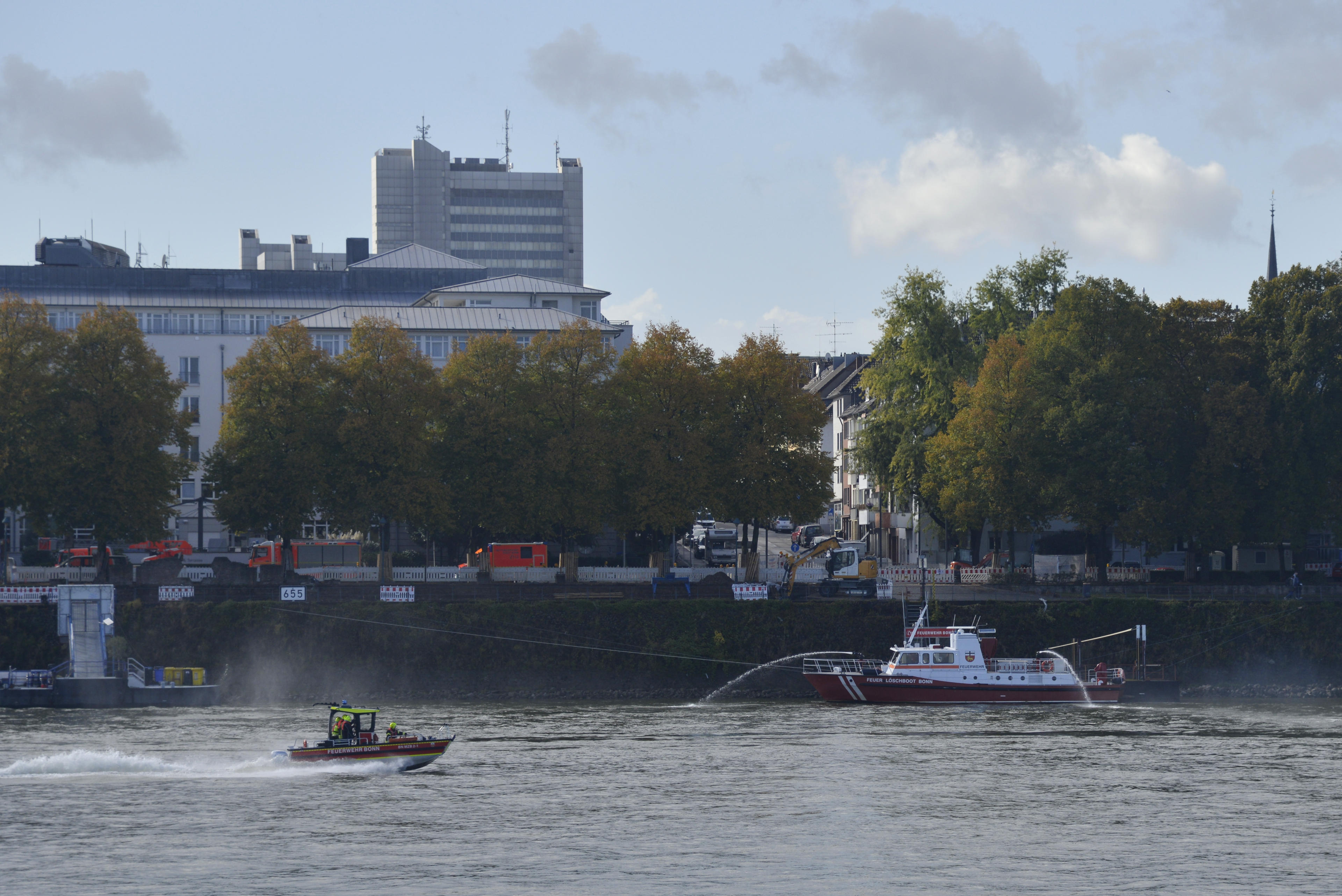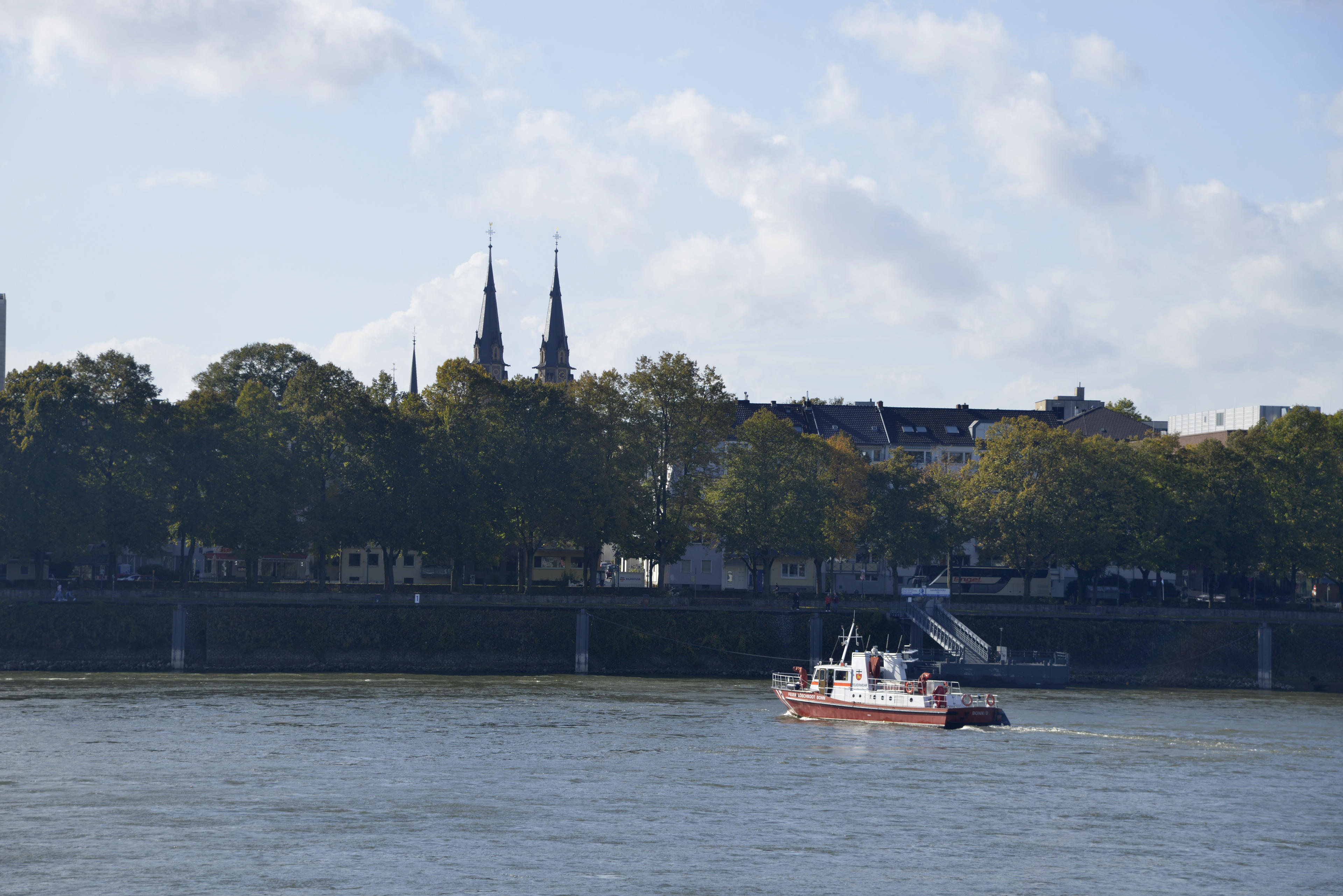 Auf dem Rhein übte die Feuerwehr derweil Löschmanöver und Mannrettung. So sah das jedenfalls aus. Den Moment, als die vorne und hinten aus dem Löschboot die volle Fontäne raus schießen haben lassen, habe ich leider verpasst. Das da ist leider nur ein feuchter Abklatsch dessen, was die da noch Sekunden vor veranstaltet haben. Wenn die da richtig Druck drauf geben, schießen diese Wasserkanonen schon ein paar dutzend Meter! Überhaupt, voll das Aufgebot da am anderen Ufer. Das muss ja schon eine richtig große Übung gewesen sein. Dass die das an einem Samstag machen, liegt da dran, dass das vielleicht auch freiwillige Feuerwehr ist und dass die deshalb dann nicht extra frei nehmen müssen?