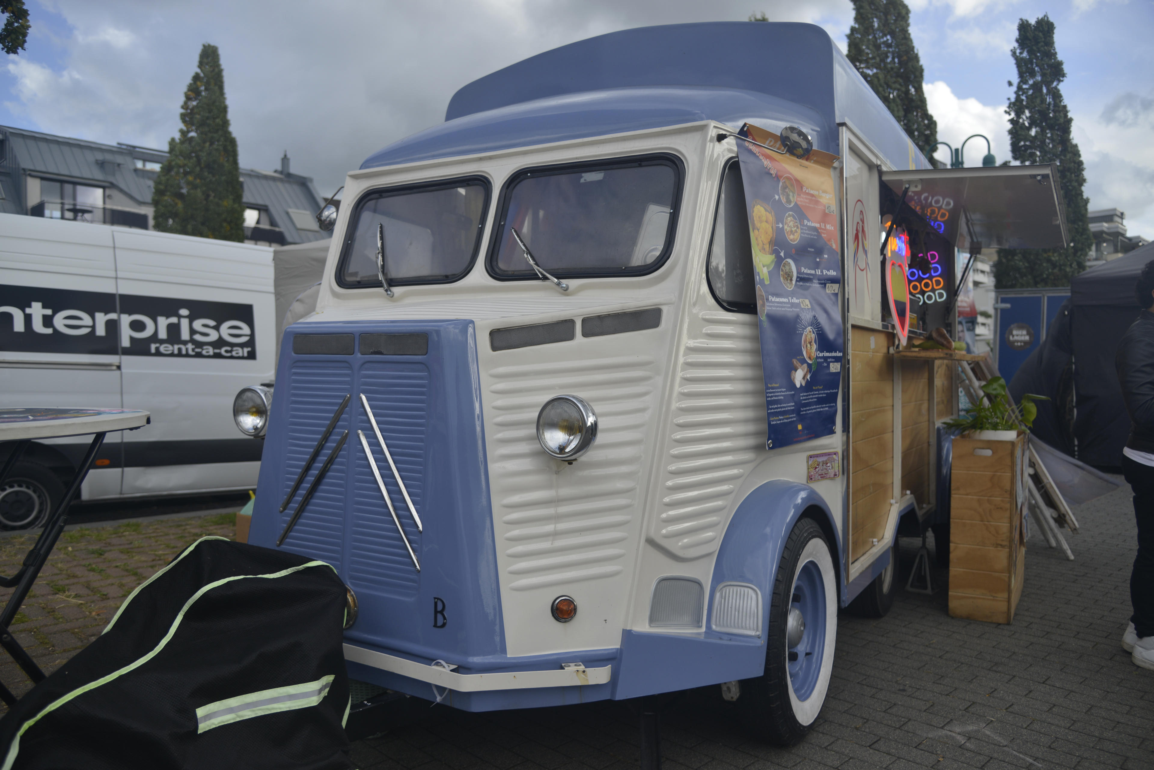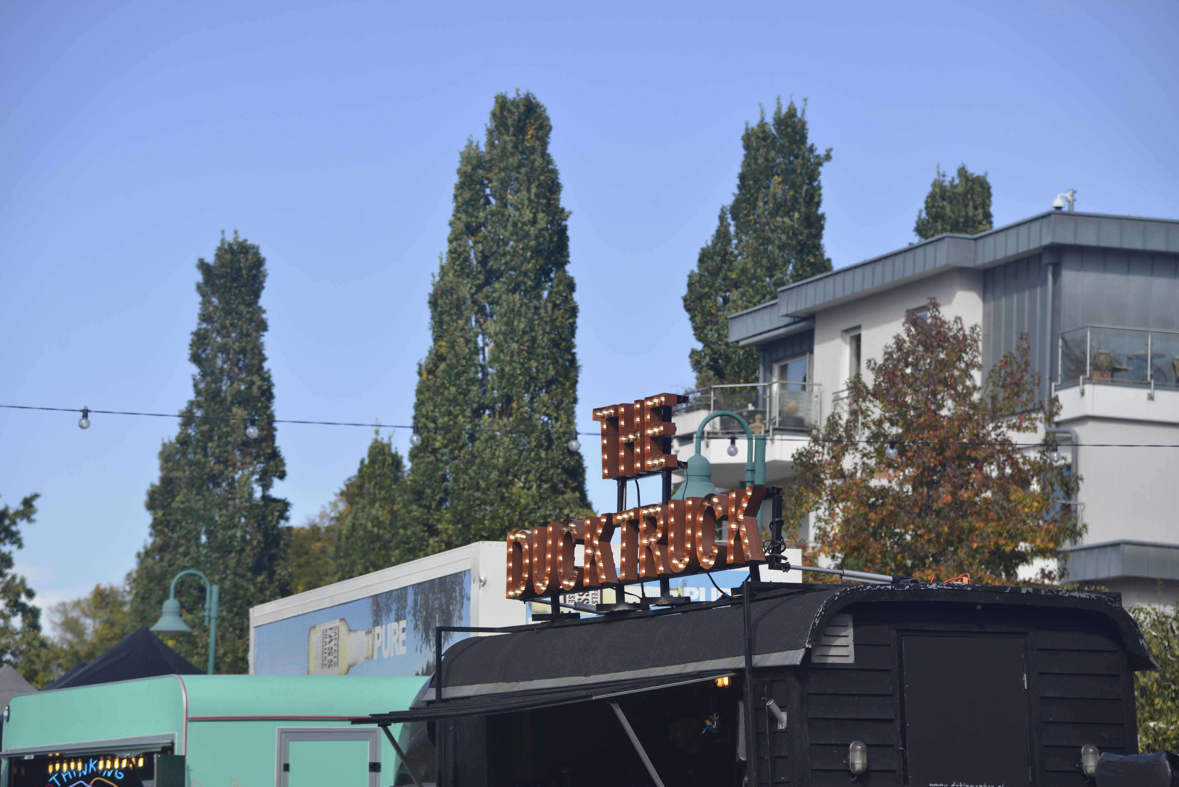 Immer, wenn ich an dem alten Preußen-Adler vorbei komme, muss ich ihn fotografieren. Das ist fast so wie mit dem Siegfried im Hennefer Kurpark, das gehört einfach dazu! ;-) Unterhalb findet man auch im Herbst immer noch die ein oder andere blühende Rose, sodass da schon wieder ein Bild fällig wird. An dieser eher geschäftigen und manchmal auch etwas schmuddeligen Ecke am Beueler Rheinufer sind diese beiden Dinge sowas wie feste Konstanten. Der Grund, weshalb wir heute mal wieder im Wohngebiet geparkt hatten, war unter Anderem, dass hier auf dem eigentlichen Parkplatz natürlich die Anhängsel der Food Trucks standen. Also, größere KFZ zum Beispiel, die mit Anhängerkupplung ausgestattet waren und teilweise auch noch mit Rangieren beschäftigt waren. Wir waren ja doch noch recht früh da. Sicher, nicht alle auf dem Parkplatz waren "Aussteller", aber sicher doch einige.