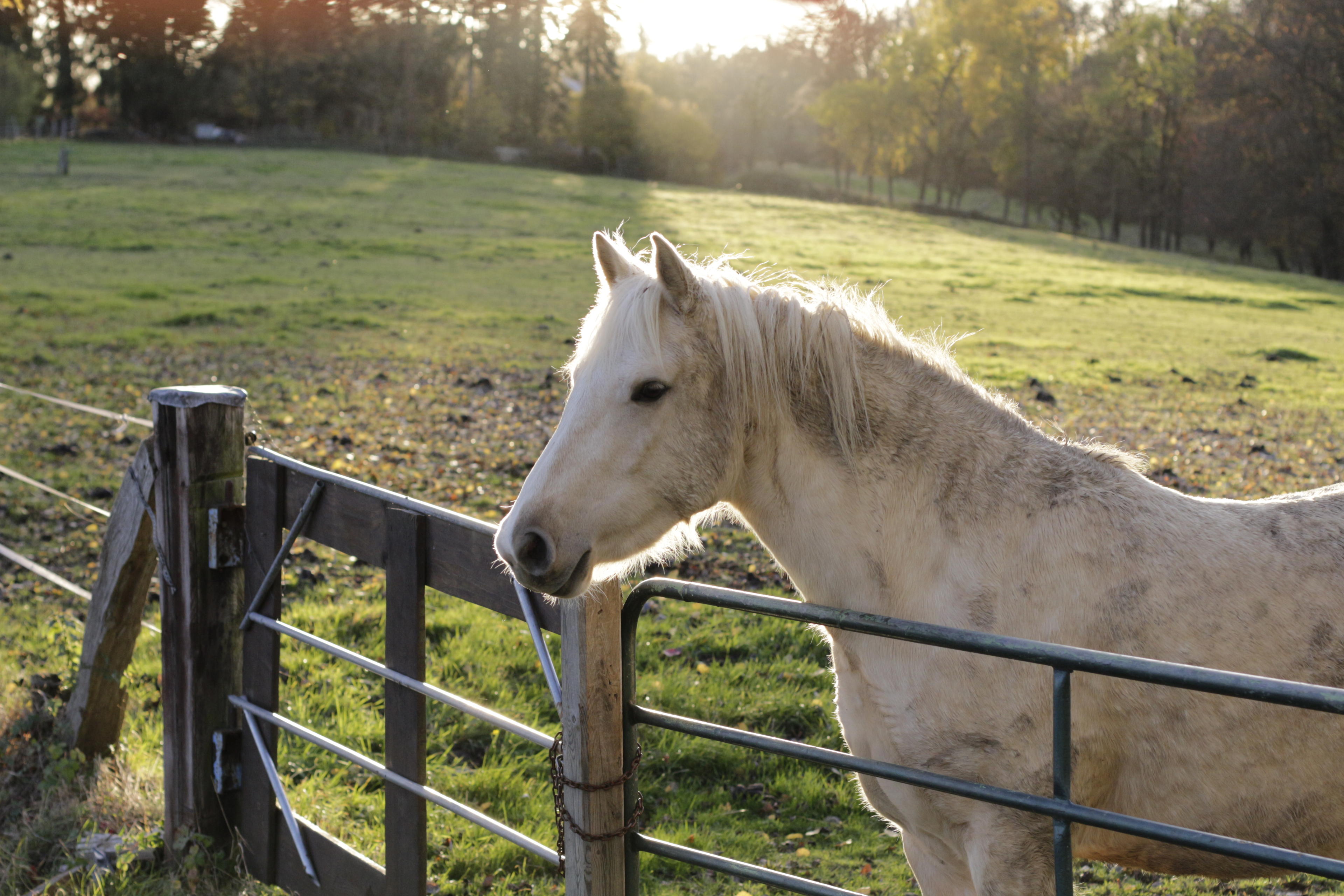 Die beiden da auf der Koppel haben sich jedenfalls so richtig in Pose geworfen gegen die untergehende Sonne. Hatten scheinbar auch Spaß, haben sich die ganze Zeit hin und her übers Feld gejagt, bis sie dann neugierig an den Zaun kamen. Und im Matsch gewälzt haben sie sich scheinbar auch mal wieder. Hmm, Matsch! "Weiß" kann man zu dem einen Kollegen ja kaum noch sagen!