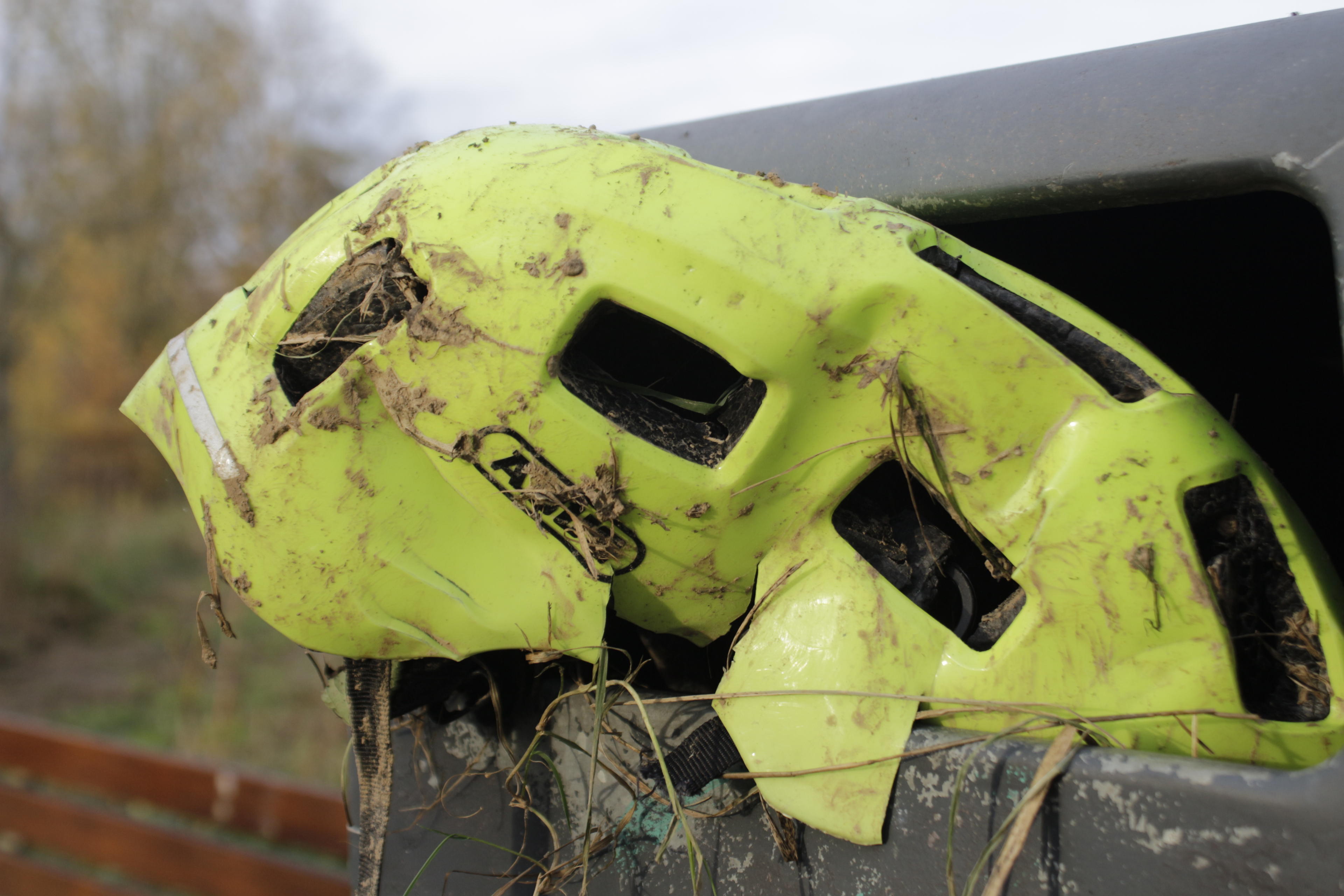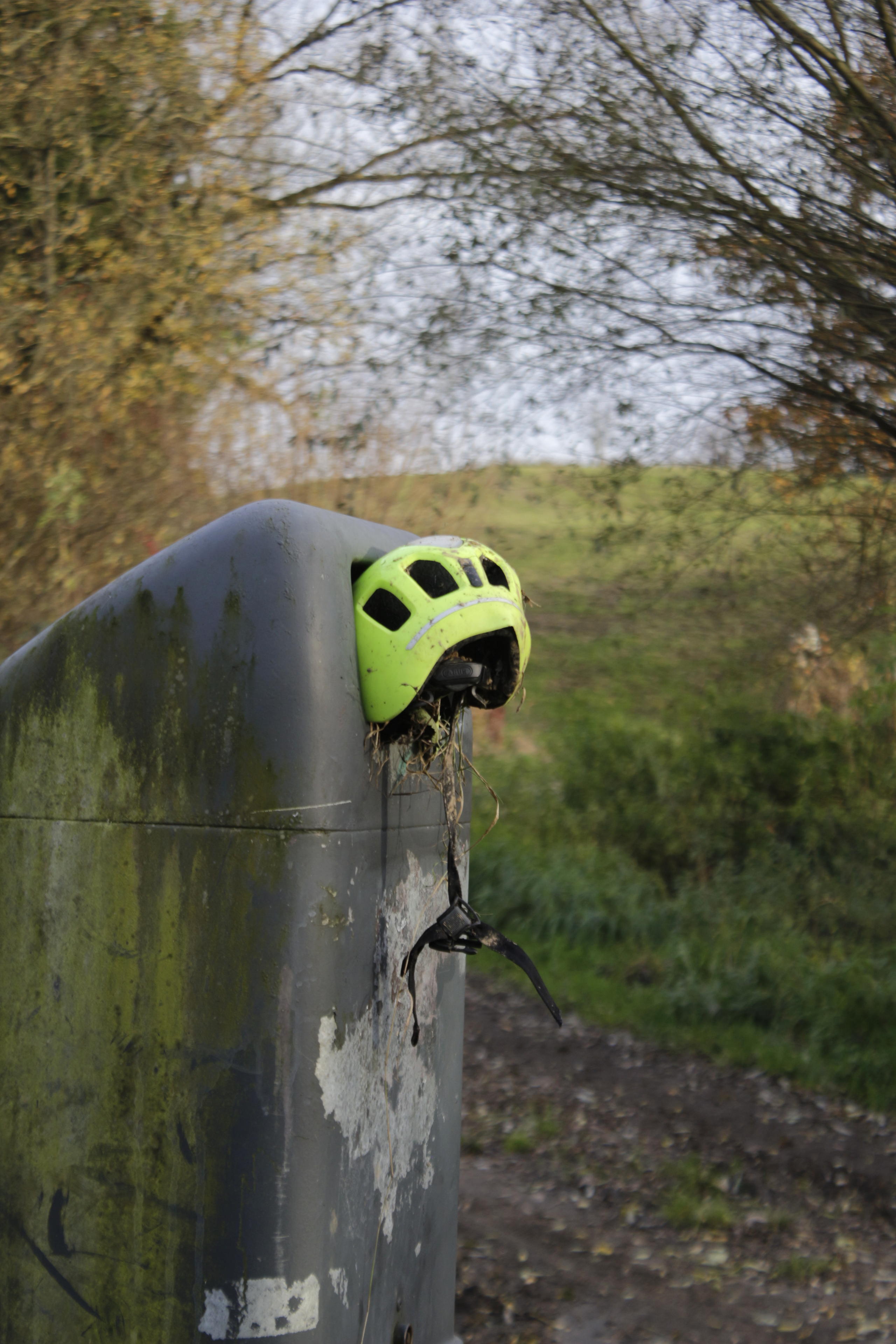 Was mit diesem Fahrradhelm passiert ist, der da im Mülleimer steckte, will ich lieber nicht wissen. Ich hoffe, da war kein Kopf mehr drin, als der Trecker drüber gefahren ist. So sieht das jedenfalls aus. Total verbeult und zerdrückt. Ich dachte, die Teile wären stabiler. Bräuchte ja auch mal dringend einen.
