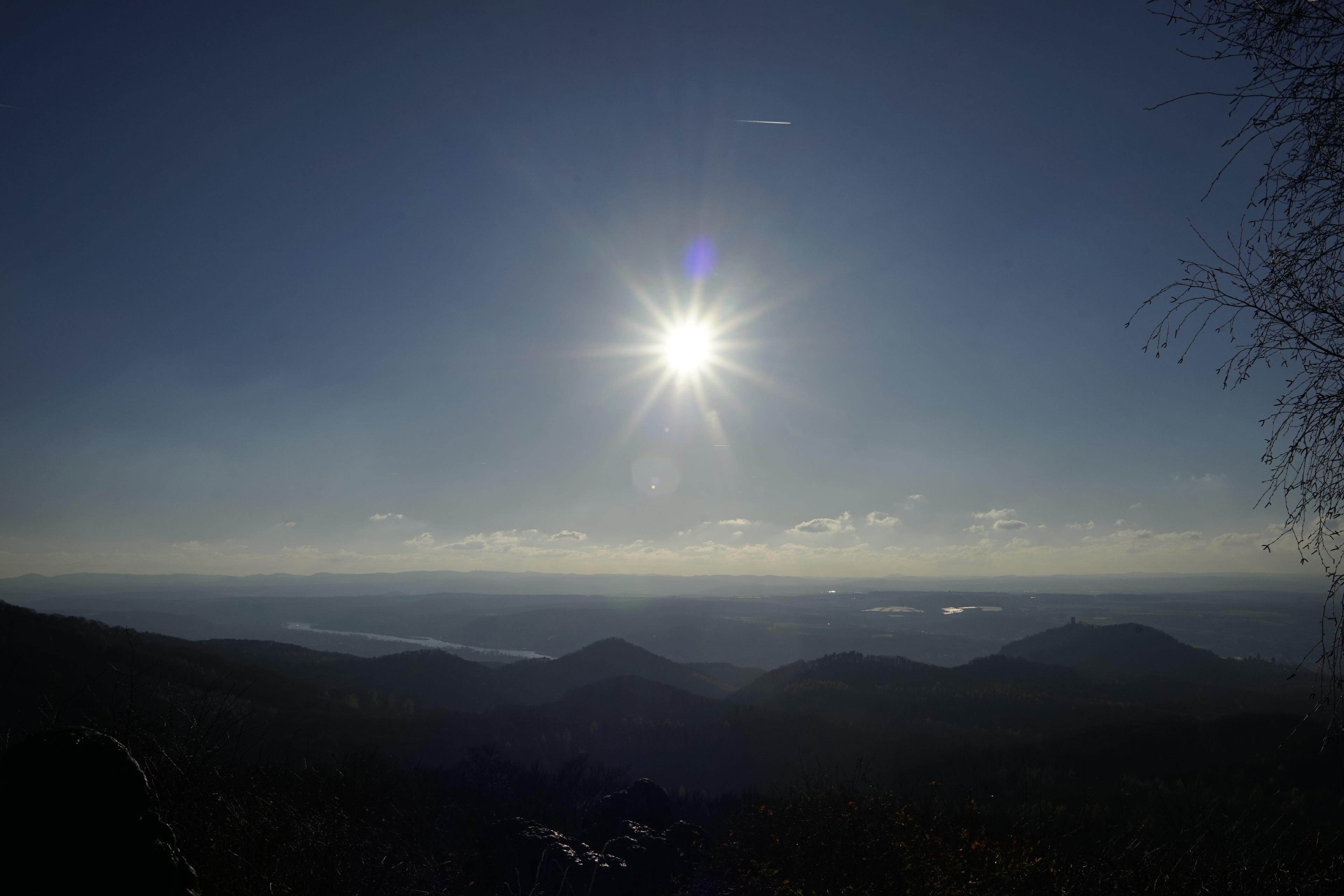 Aber nichts, was man nicht in der Waschmaschine raus kriegen würde. Die letzten paar Meter sind dann geprägt vom Sendemast, bis man schließlich auf der Aussichtsplattform vorm Ausflugs-Restaurant steht. Habe dann mal die Blende ganz weit zu gemacht und mit dem Weitwinkel voll in die Sonne gezielt. Das macht ja erstaunlich hübsche Sonnenstrahlen! Wusste ich gar nicht. Aber auf die Dauer nicht gut für den CCD, nicht dass der mir da zu heiß wird. Aber ein sehr schönes Foto vom Rheintal, muss ich mich ja wieder selber loben, tut ja kein anderer!