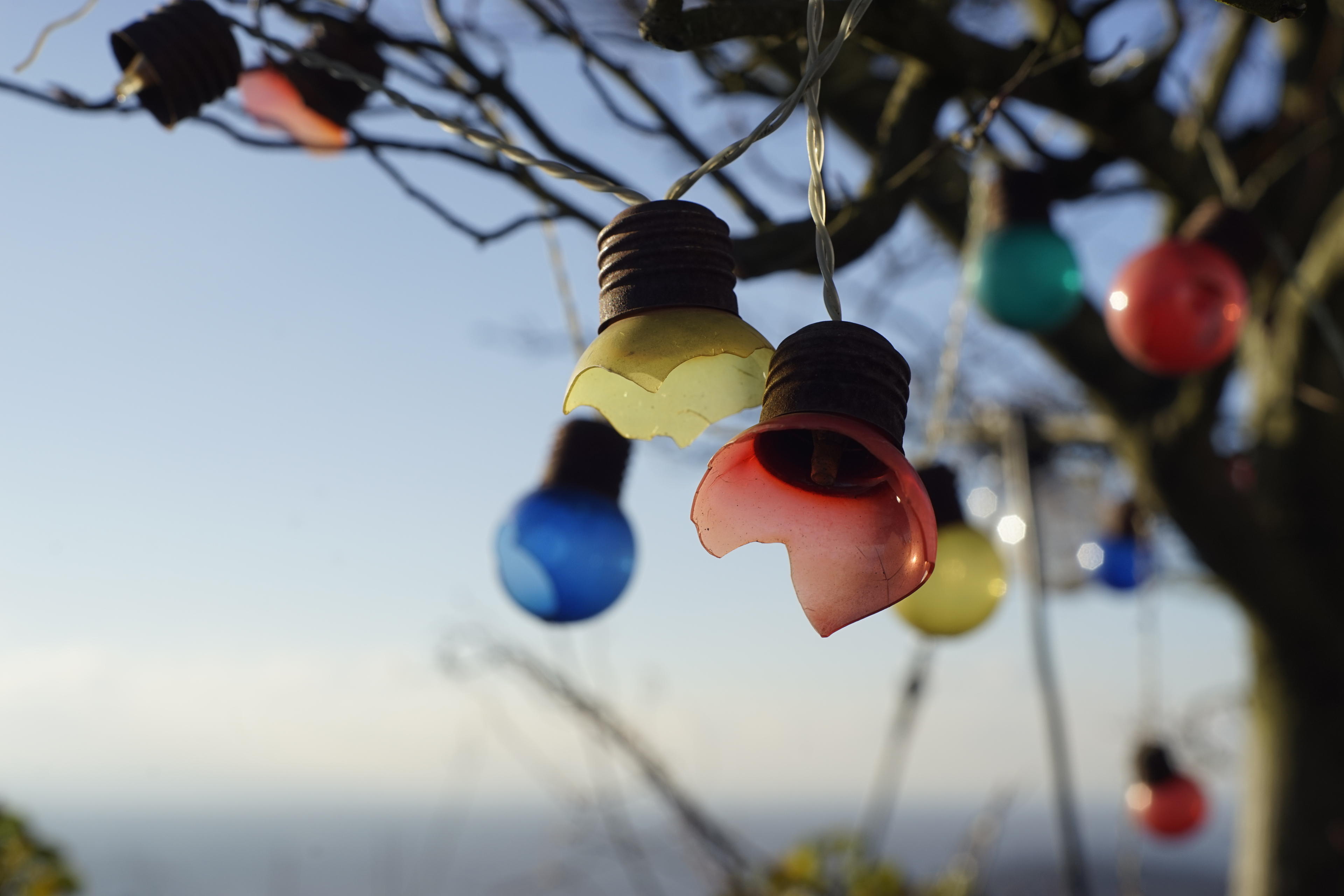 Die zerbrochenen Lampen der Lichterkette fotografiere ich hier oben ja scheinbar auch jedes Mal. Aber die kommen gerade in diesem knalligen Herbstlicht so richtig bunt rüber, da kann ich ja nicht einfach so dran vorbei gehen. Aber dann musste ich mich wieder mit dem Ausblick beschäftigen. Die Sicht war an jenem Tag aber auch mal wieder besonders gut. Sämtliche Ruinen ringsrum waren hervorragend zu erkennen und der Blick nach Bonn und Köln war den Aufstieg ebenfalls wert. In der Ferne über der Eifel und angrenzenden Gebieten war es dann allerdings schon ein bisschen dunstig, wobei das im Foto nachher seltsamer Weise mehr in Richtung grünlich statt bläulich geworden ist. Hab ich den Weißabgleich geärgert? Kam mir "in Echt" nicht so grün vor.
