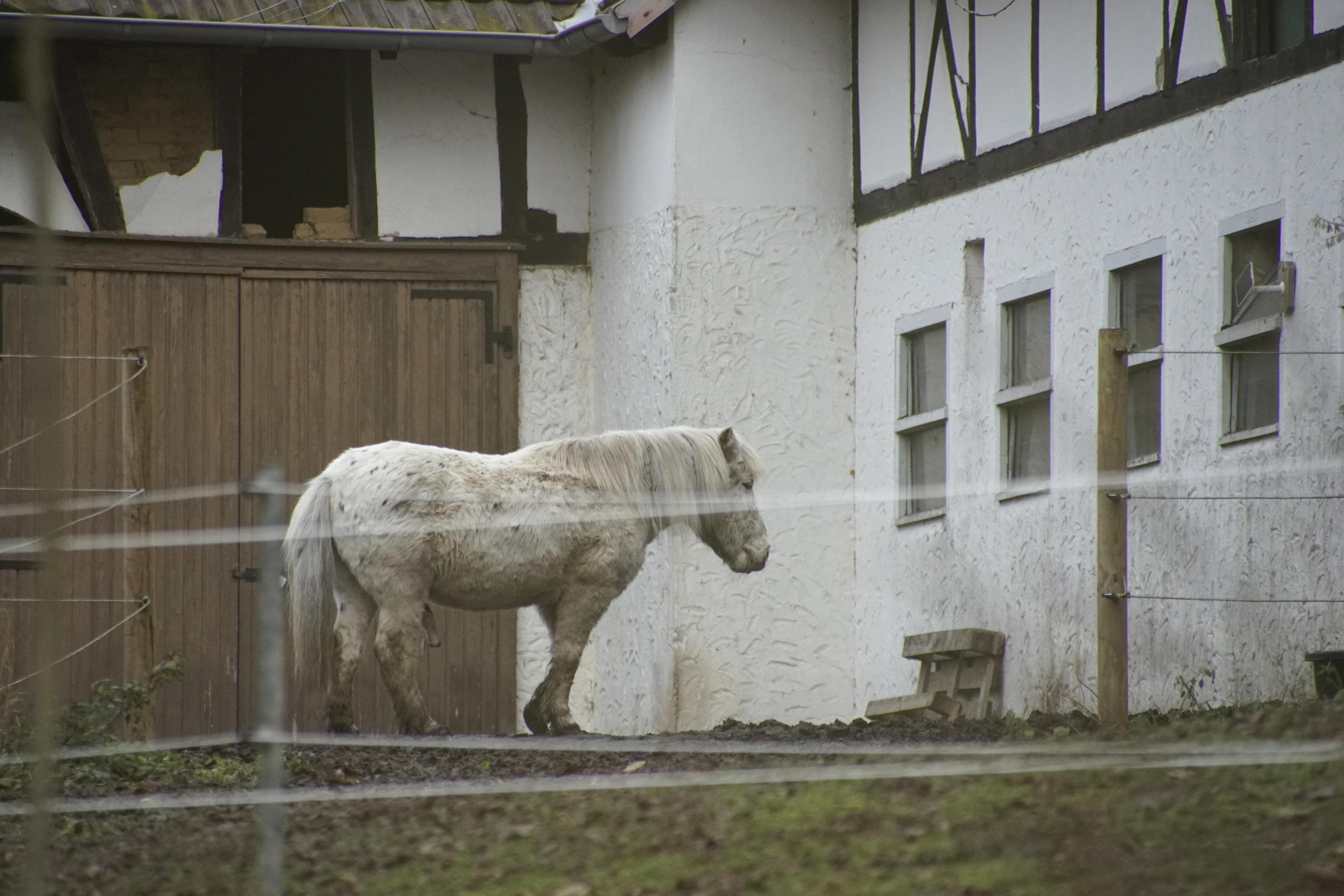 Die Pferdekoppeln beginnen ja praktisch dort, wo der Friedhof aufhört. Man muss praktisch nur an de Kreuzen vorbei, hinten durchs Tor und dann den ganzen Weg an der Mauer zurück. Aber bereits von hier oben kann man das erste Exemplar sehen, dass ich mit den magischen 400mm auch schon recht nah ran holen konnte. Natürlich mit erhöhtem ISO-Rauschen, weil es da doch schon sehr talwärts am Hang steht und vor allem noch immer sehr weit weg war. Das war dann so hmmnaja, dass ich es weg gelassen habe und einfach stattdessen das weiße direkt vor seinem Stall hier eingebunden habe. Ich merke deutlich, dass dieses Objektiv Sonne nicht nur liebt, sondern diese geradezu anbetet. Wenn sie weg ist, ist es ganz traurig.