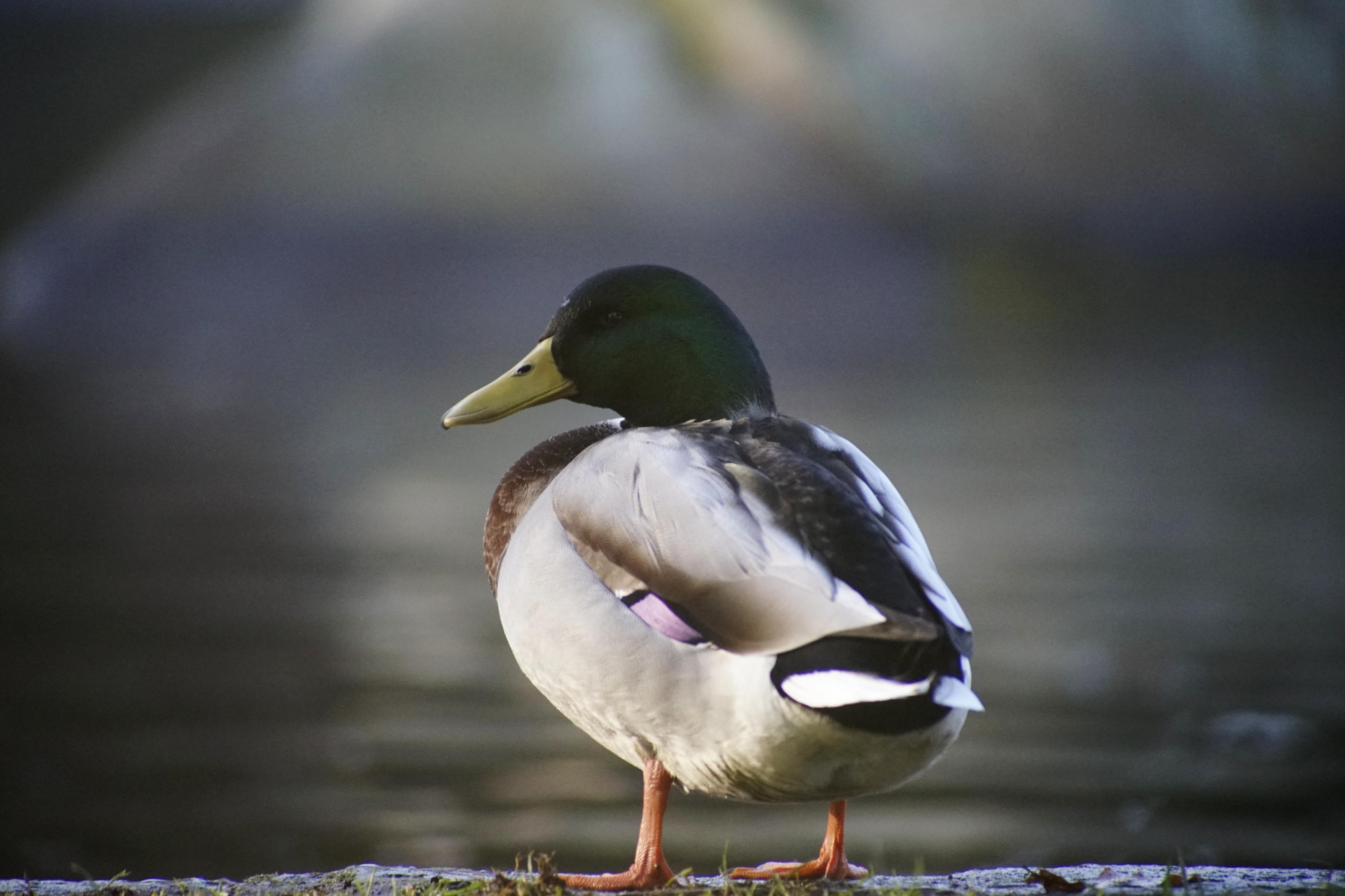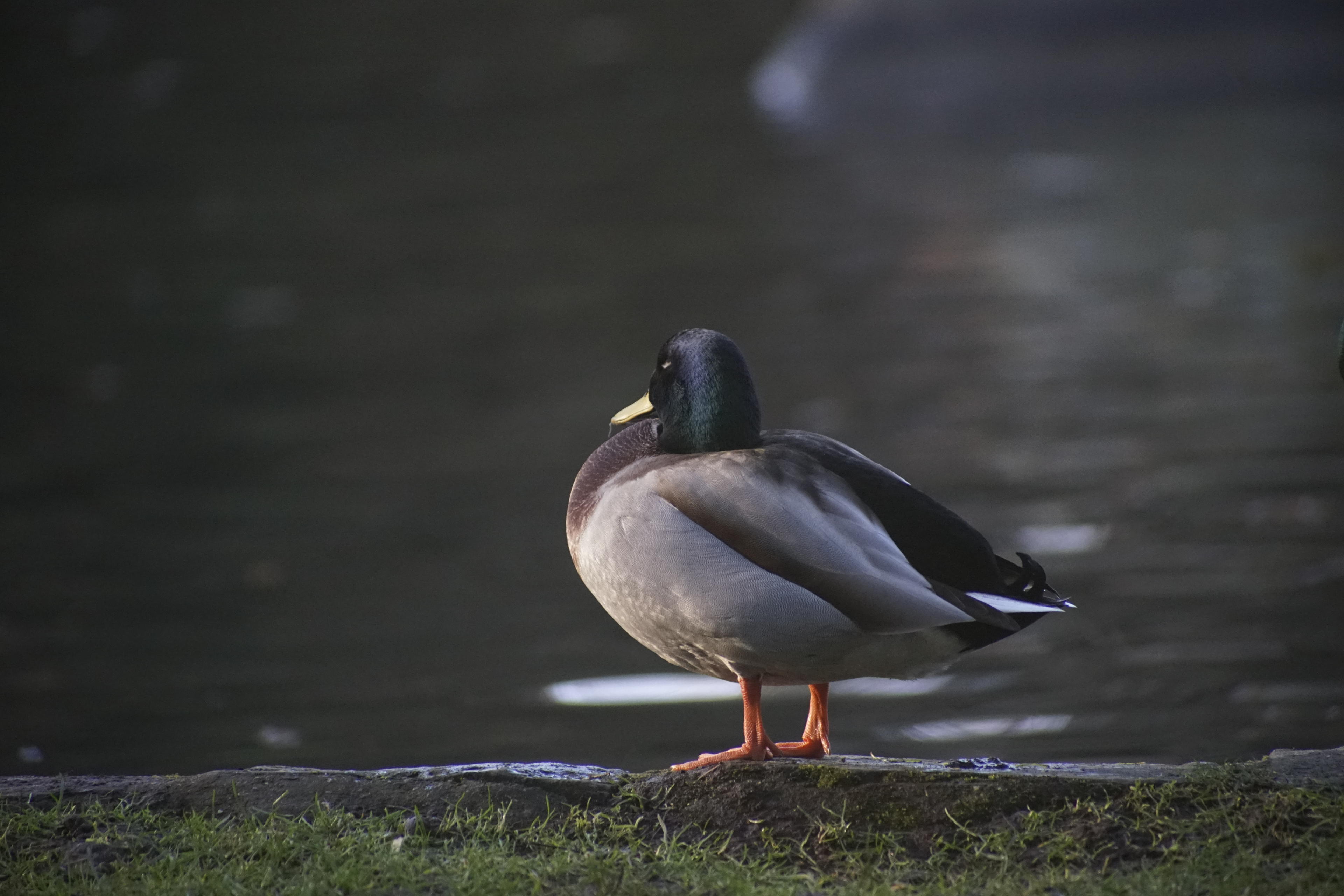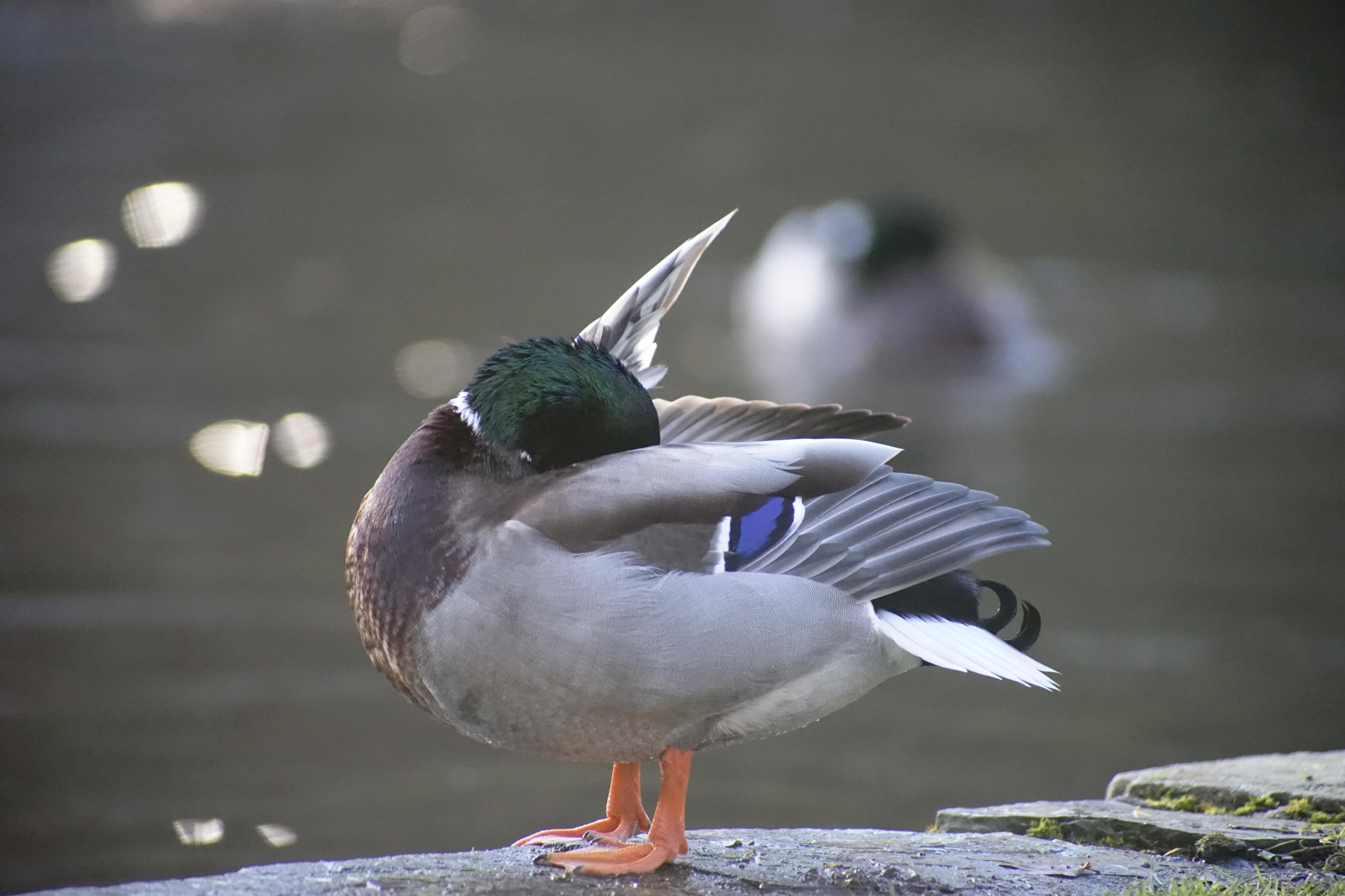 Am Teichrand hatten sich die meisten aufgereiht und dösten vor sich hin, während andere mit Putzen und Dehnen beschäftigt waren. So auch diese Yoga-Ente. Oder die daneben, die zuguckt, was die Kollegen so treiben. Da die Enten im Kurpark Leute gewohnt sind, lassen sie einen auch sehr nah ran kommen, sodass ich die volle Vergrößerung des AT-X dazu verwenden konnte, die mal so richtig groß auf den Sensor zu kriegen! Nur das mit dem In-die-Knie-gehen klappte noch nicht wieder so richtig, nachdem ich mich die Woche davor ja so auf den Planeten geworfen hatte. Das Knie war an dieser Stelle zwar schon nur noch mäßig blau, aber längere Zeit diese Stellung halten, in der ich normalerweise Enten fotografiere, das war nicht drin. Daher dieses mal hauptsächlich höhere Winkel, statt der flachen, die ich im Allgemeinen für Viecher verwende.