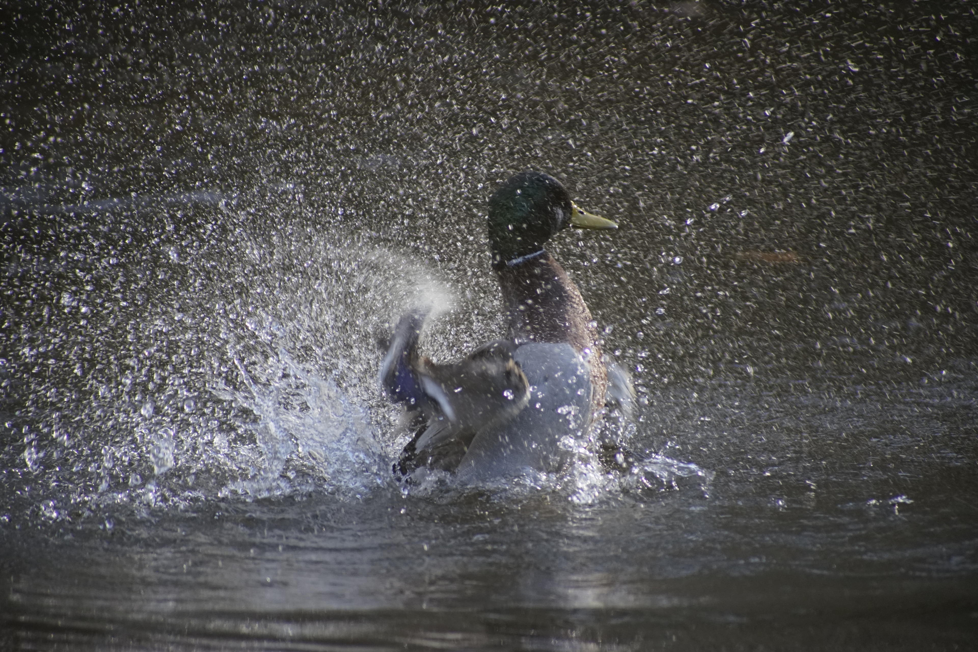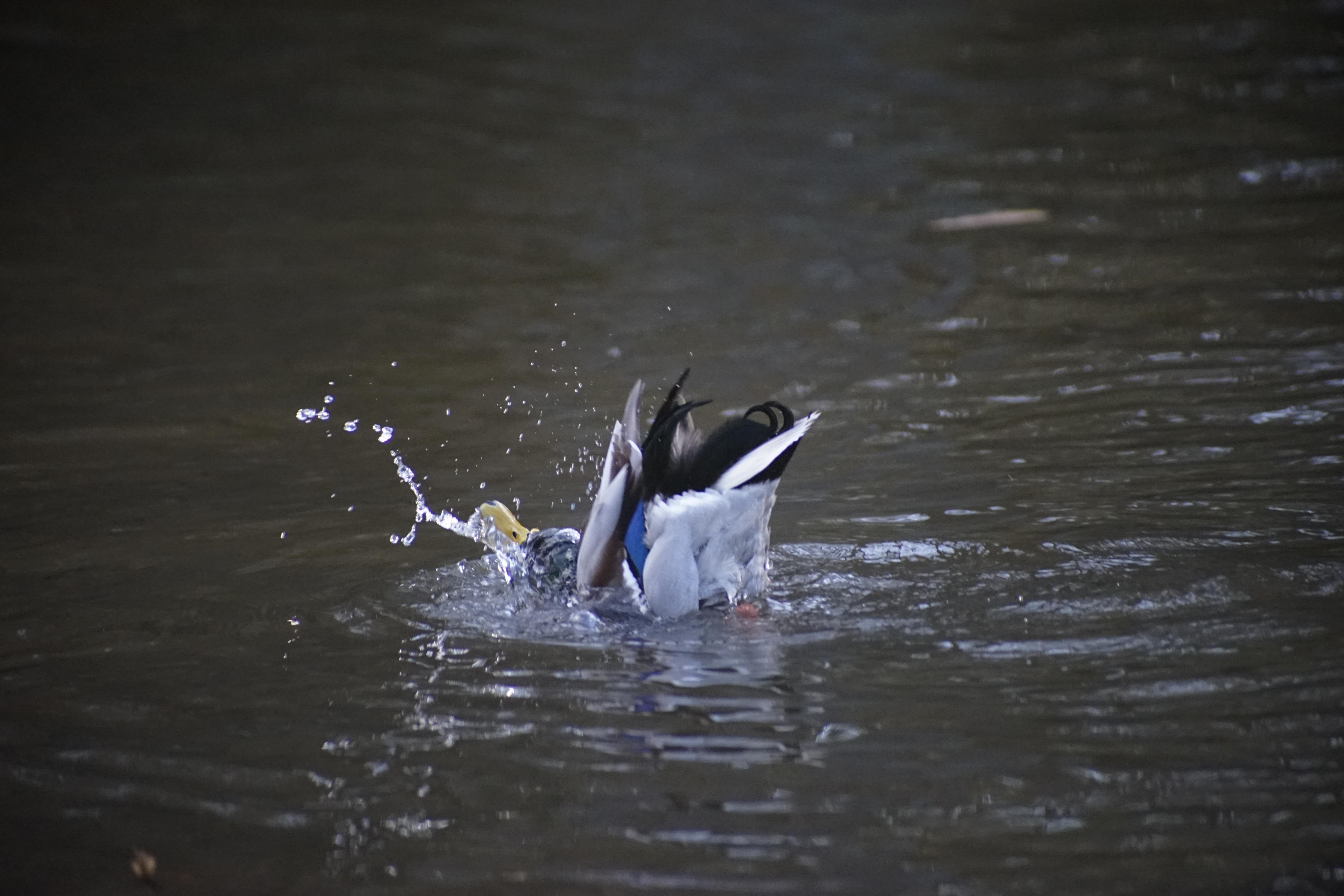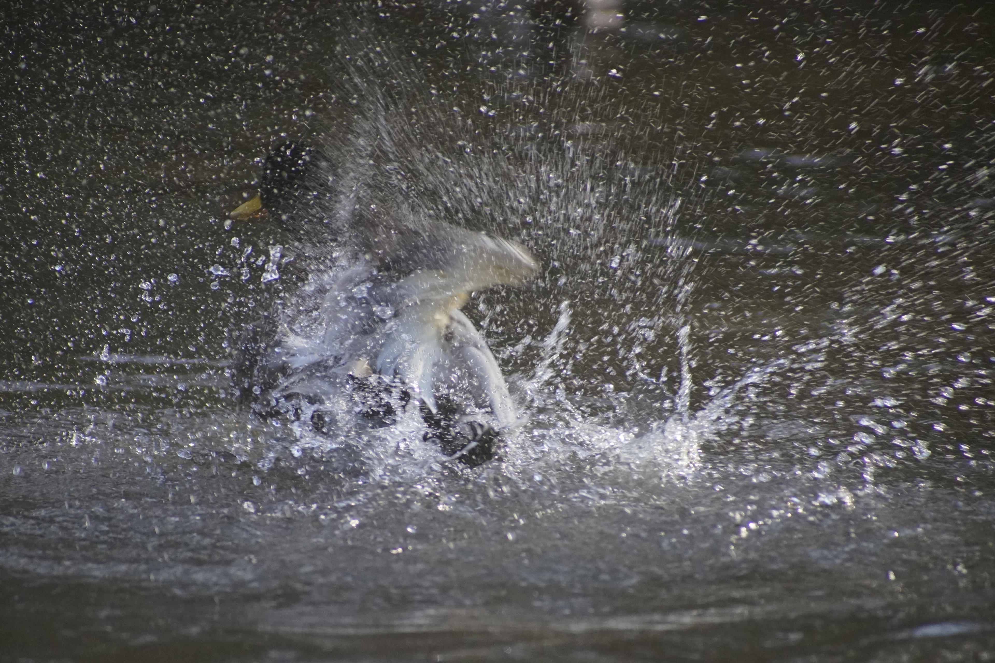 Vor dem Putzen kommt für die ganz schmutzigen Exemplare noch die übliche Köpfchen-unters-Wasser-Schwänzchen-in-die-Höh-Übung. Die können ja ein Wasserspiel veranstalten! Da kommt die Wal-Fontäne im Kurparkteich ja kaum hinterher, die wird ganz neidisch! Trotz der einigermaßen kurzen Belichtungszeiten, die ich wegen der Brennweite ja brauchte, ist alles schwer verschmiert, was da in die Luft spritzt!