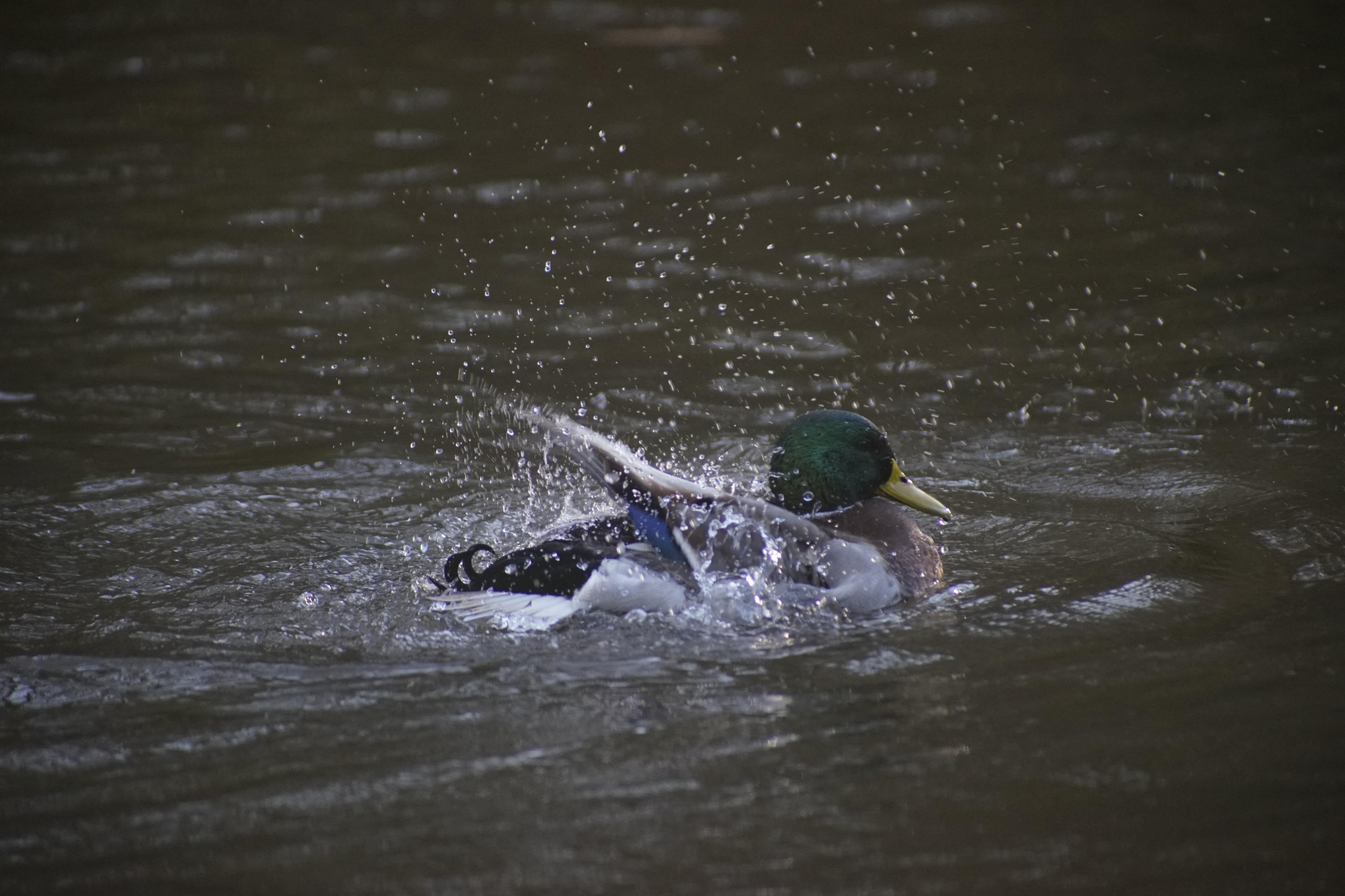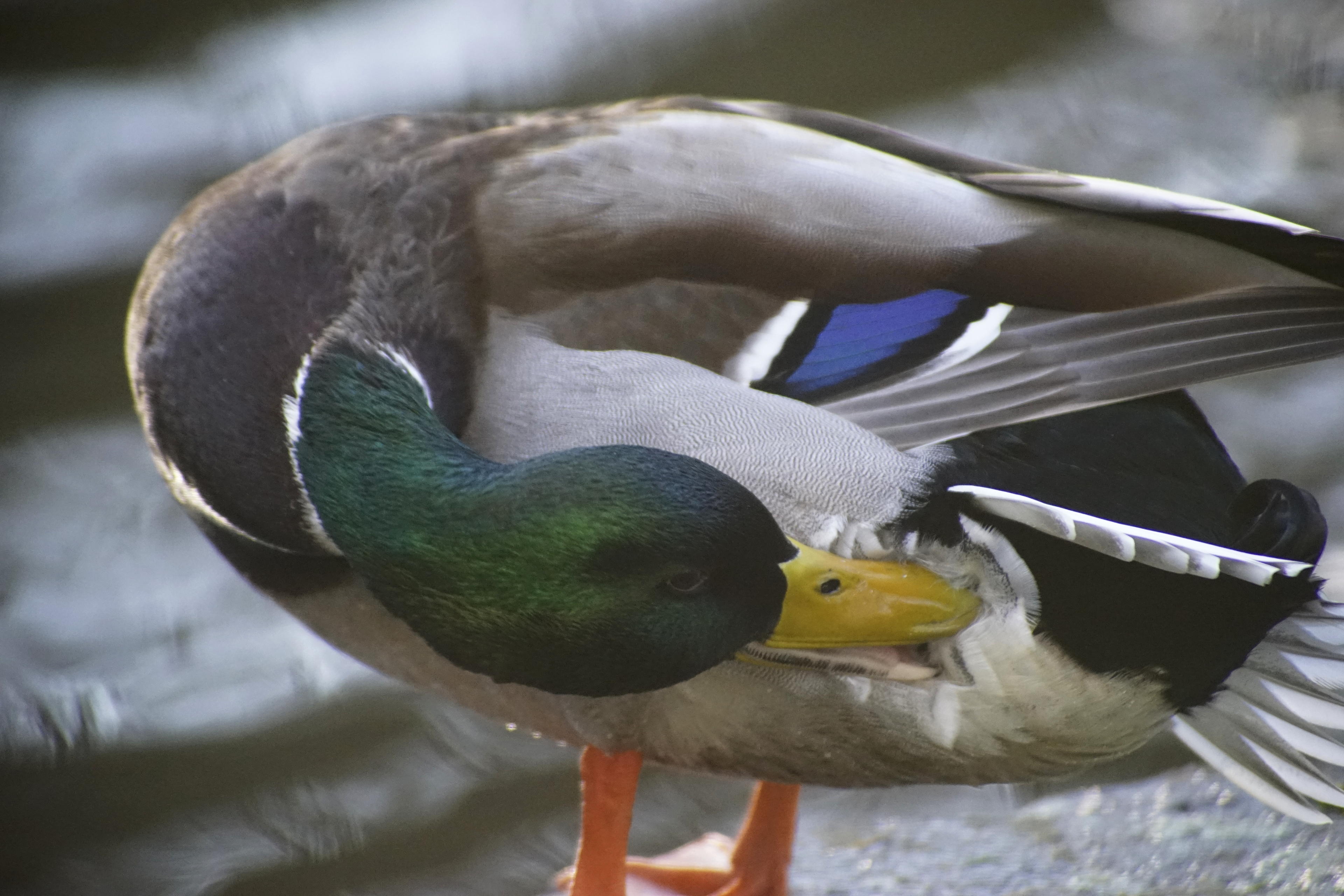 Nach dem Strecken kommt jedenfalls das Putzen. Ich finde es immer wieder erstaunlich, wie viele kleine zahnartige Zähne die Enten in ihren Schnäbeln haben. Kann man auf den Bildern teilweise erkennen, teilweise aber auch nicht, weil die sich mal wieder viel zu schnell bewegt haben, sodass weder die Belichtungszeit noch der Autofokus hinterher kamen. Ist aber scheinbar nicht nur praktisch zur Futtersuche, sondern auch geeignet zur Fellpflege. Öhm, Gefiederpflege. Sorry, alles Hautanhanggebilde, ich unterscheide da nicht so.