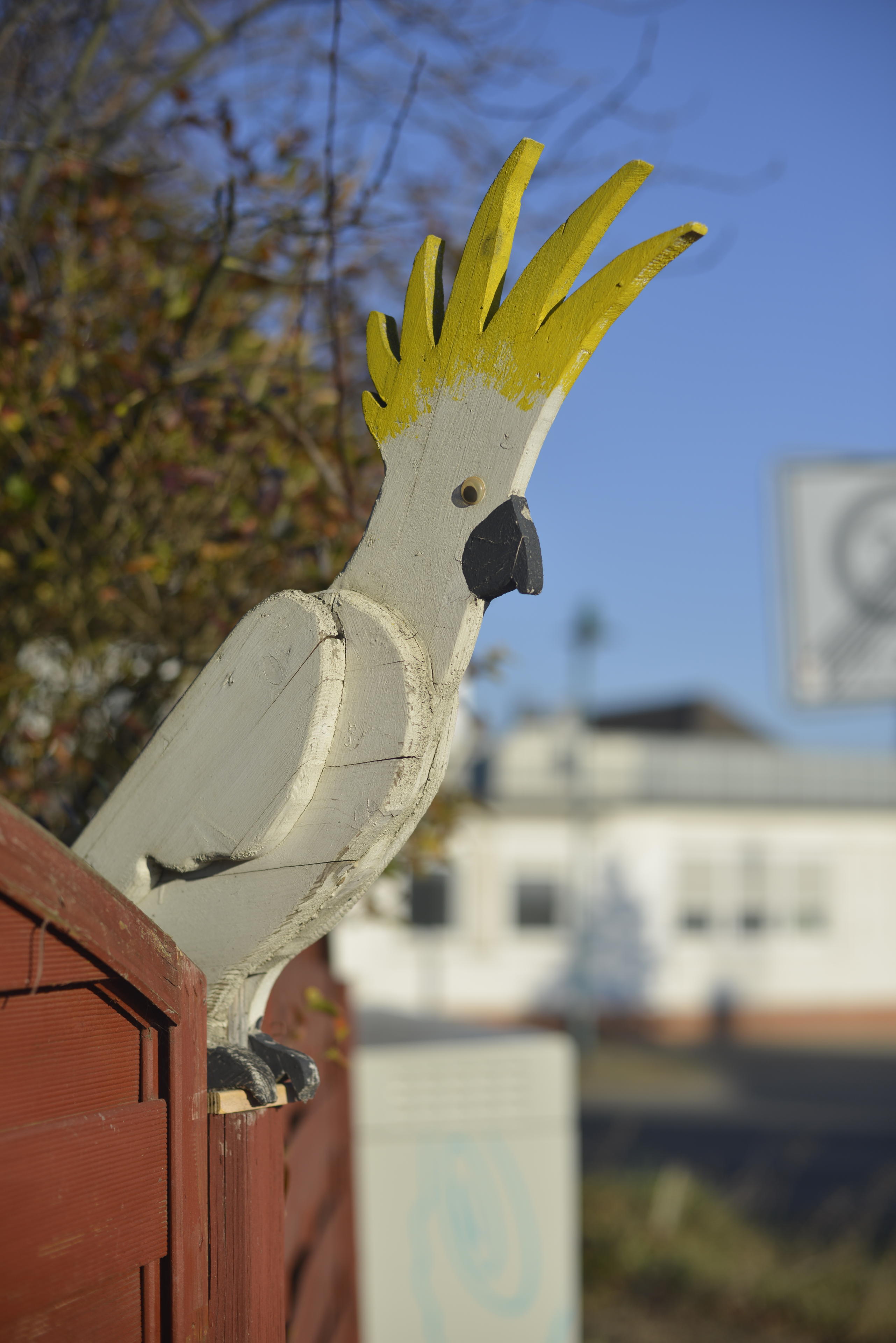 Dann waren wir auch schon am Ende des Uferweges angekommen. Nach dem Überholverbotsschild kommt ja nur noch Sackgasse. Also hoch auf die "Promenade" und dann durchs Dorf zurück geschlichen. Unterwegs den Kakadu getroffen, auch wenn ich jetzt schon wieder nicht wüsste, wie ich da wieder hin käme. Irgendwo an der Schule an der Kirche wieder raus gekommen. Ich verlauf mich auch noch in so'nem kleinen Dorf!