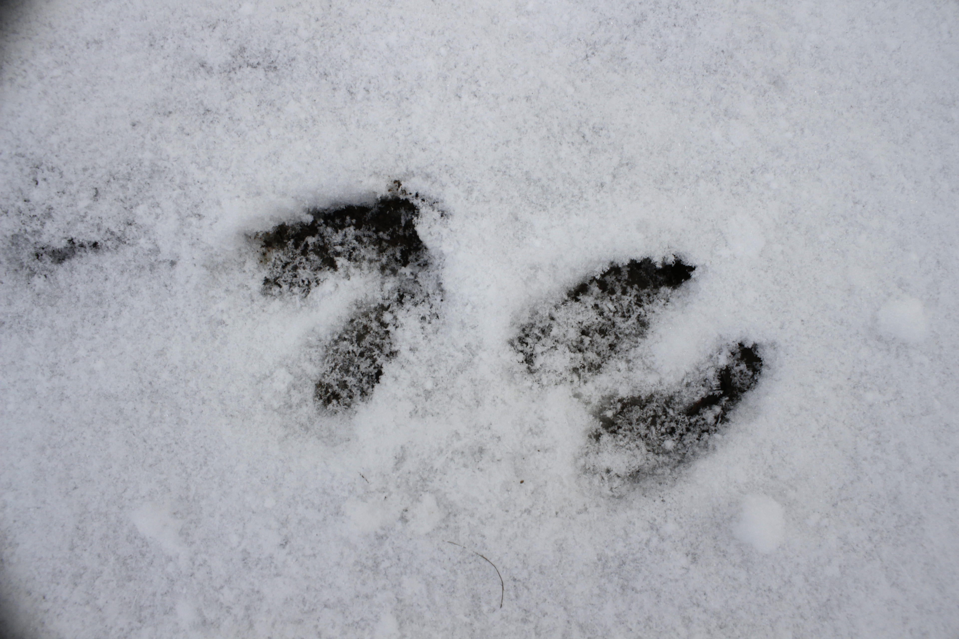 Irgendwann konnte ich mich dann loseisen und ich habe meine Runde den Berg hinauf entlang des Hundeweges fortgesetzt. Dass hier auch heute noch reger Hundeverkehr ist, sieht man an den Tatzenspuren. Aber auch anders Viehzeugs läuft hier rum: Ich nehme an die Krallen stammen von einer Amsel, das würde größenmäßig passen. Und das andere war wohl ein Reh. Ungefähr an dieser Stelle habe ich auch den Zaunkönig aufgescheucht - sorry -, aber der war zu schnell, als dass ich hätte ein Foto machen können.