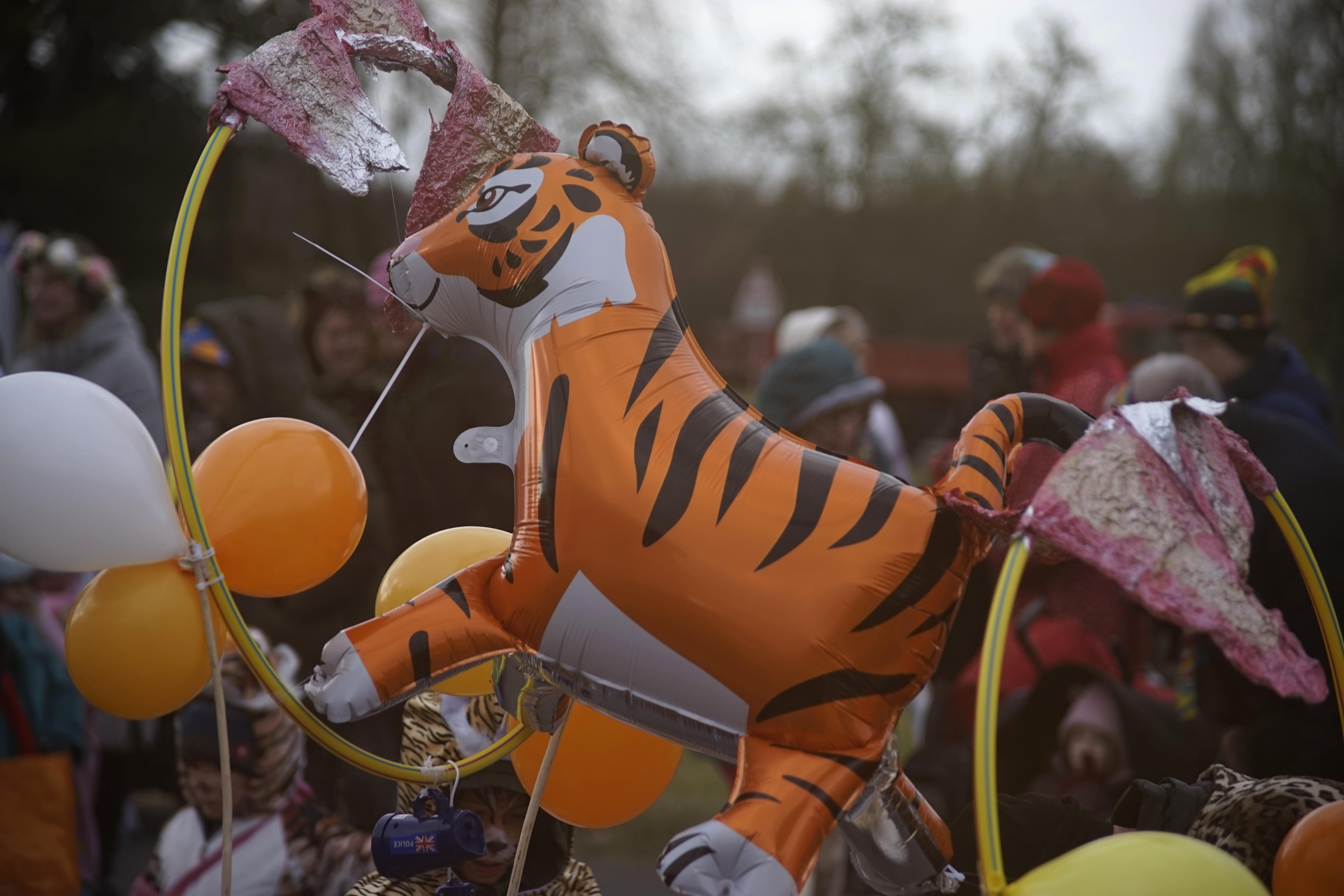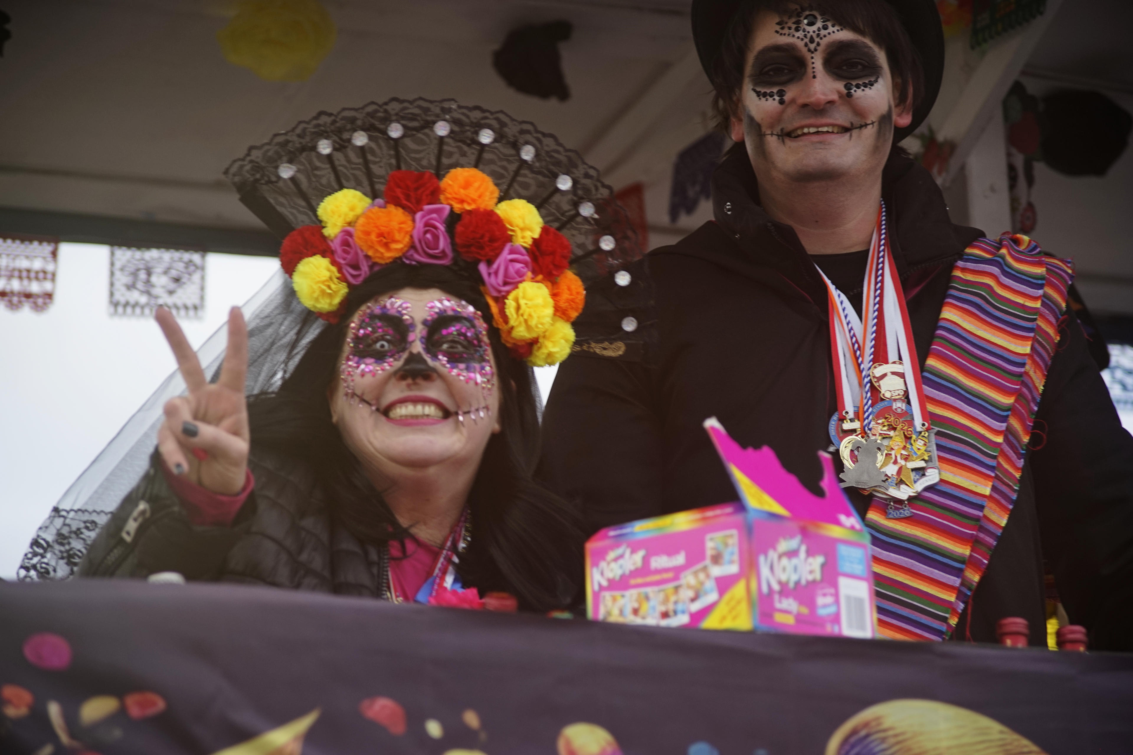 Und auf einem der Wagen fuhr dann tatsächlich noch der Chef vom Dorf mit, unser Bürgermeister, der Herr Dahm. Den hab ich gar nicht erkannt, in dem "Day of the Dead"-Outfit. Erst, als ich mir nachher die Fotos angeschaut habe, da ist er da drauf, neben dem Mädel mit dem Victory-Zeichen. Verfolgt vom Tiger. Karneval ist schon eine sehr verrückte Zeit hier im Rheinland! (Ach?)