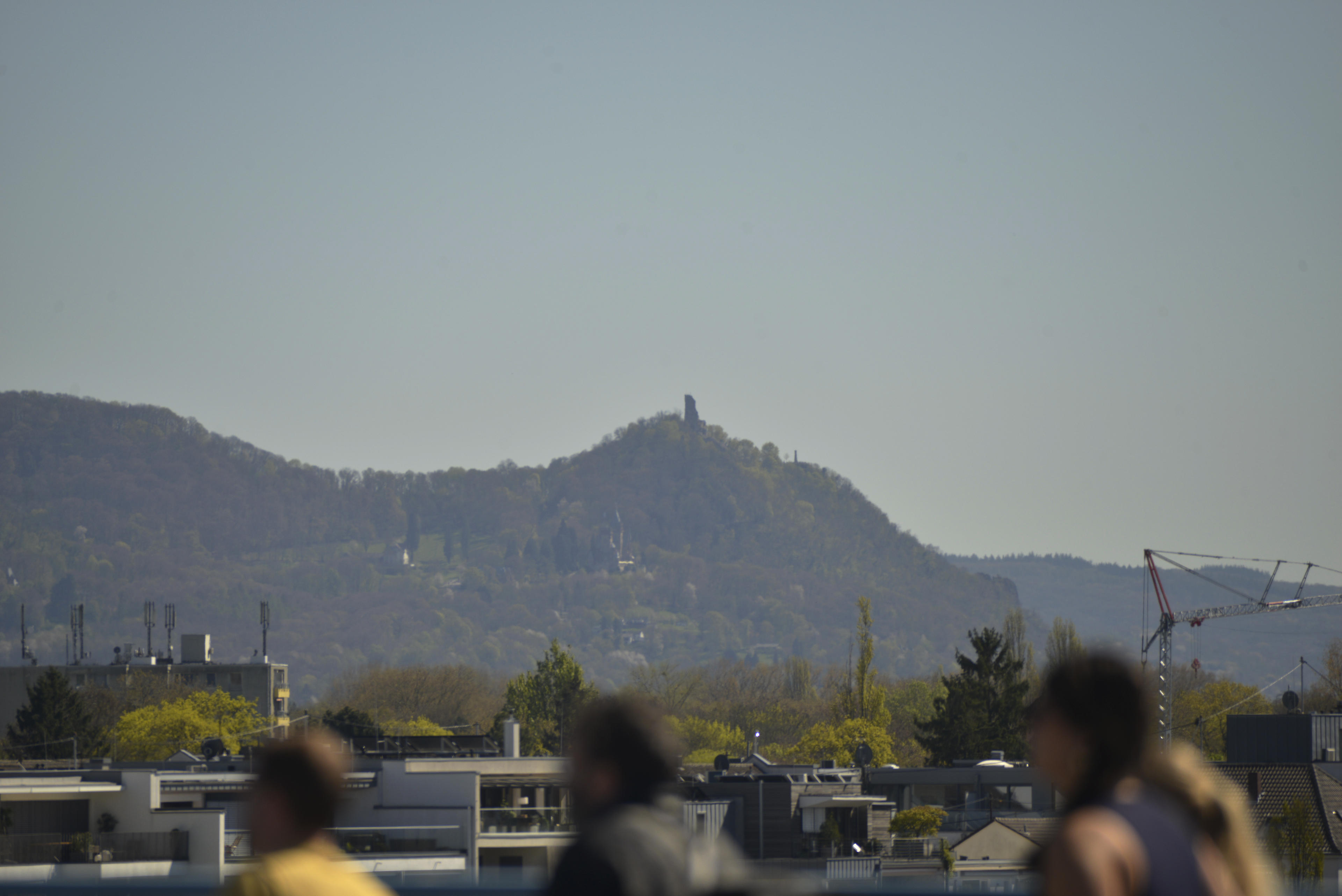 Ansonsten hat man von der Brücke ja beste Aussichten auf diverse Kirchen Bonns sowie ins Siebengebirge. Sowohl Drachenfels als auch das Gästehaus auf dem Petersbegr bekommen somit ein checkmark. Auch wenn mir da schon wieder Leute ins Bild geradelt sind. Aber wie heißt es so schön in einem alten Fotografenspruch? "Vordergrund machts BIld gesund?!" Oder war's der HIntergrund? Ach, egal! Einfach drauf halten! Was nicht bei drei auf den Bäumen ist (oder oben bei der Möwe auf dem Laternenmast), muss damit leben, dass es mit auf dem Bild ist!