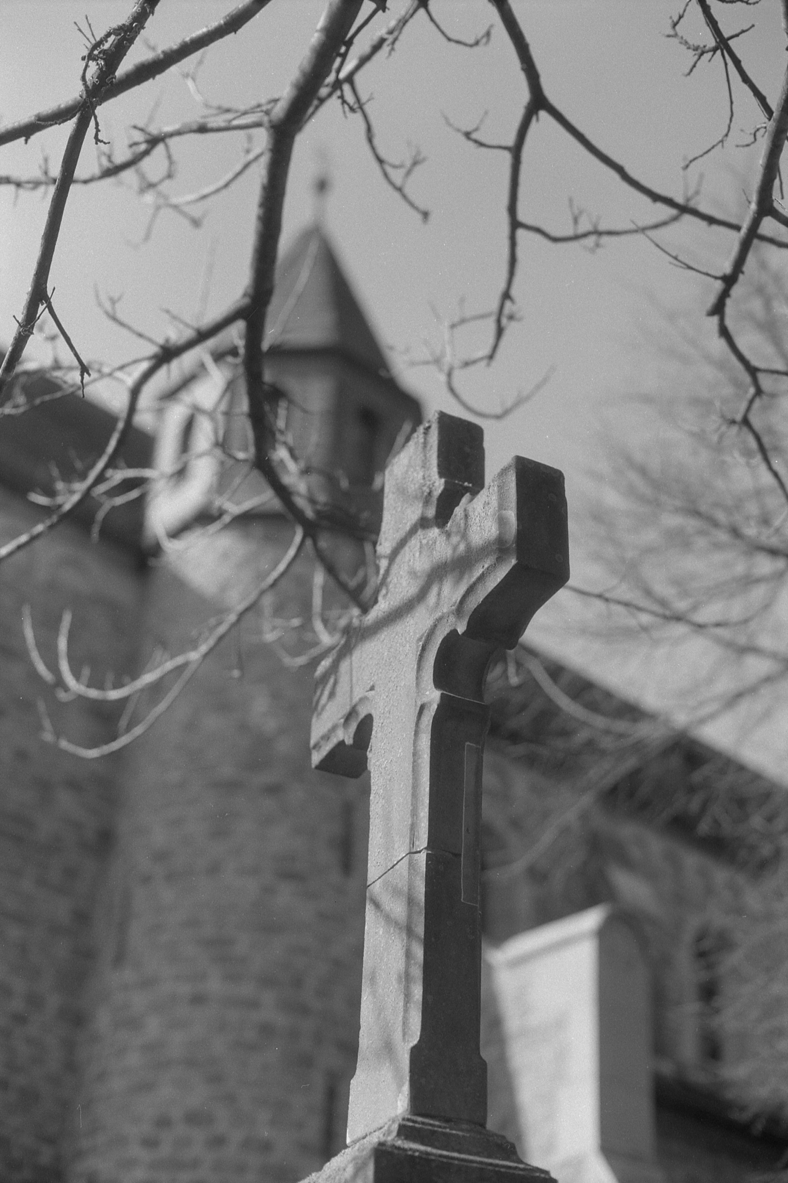 Dann bin ich an der Seite hoch auf den Friedhof. An der Kapelle das Kreuz mitgenommen, mit einer "normalen" Brennweite, während ich für das freistehende mitten auf dem Friedhof mal wieder das Sigma drauf montiert habe und aus größerer Entfernung drauf gehalten habe: Macht interessante Unschärfe-Effekte mit dem Baum im Hintergrund! Cooles Bild! Dann weiter oben zur Tür raus und am alten jüdischen Friedhof angehalten. Was ich weiter oben zum Thema Krieg gesagt habe, gilt wohl auch für jede Form von Fremdenfeindlichkeit und Rassismus, weshalb auch diese Steine wichtig sind. Aber ich habe das Gefühl, auch hier sehen die meisten Leute nur noch, ohne zu verstehen. "Nicht zu hassen, zu lieben sind wir da." Joah.