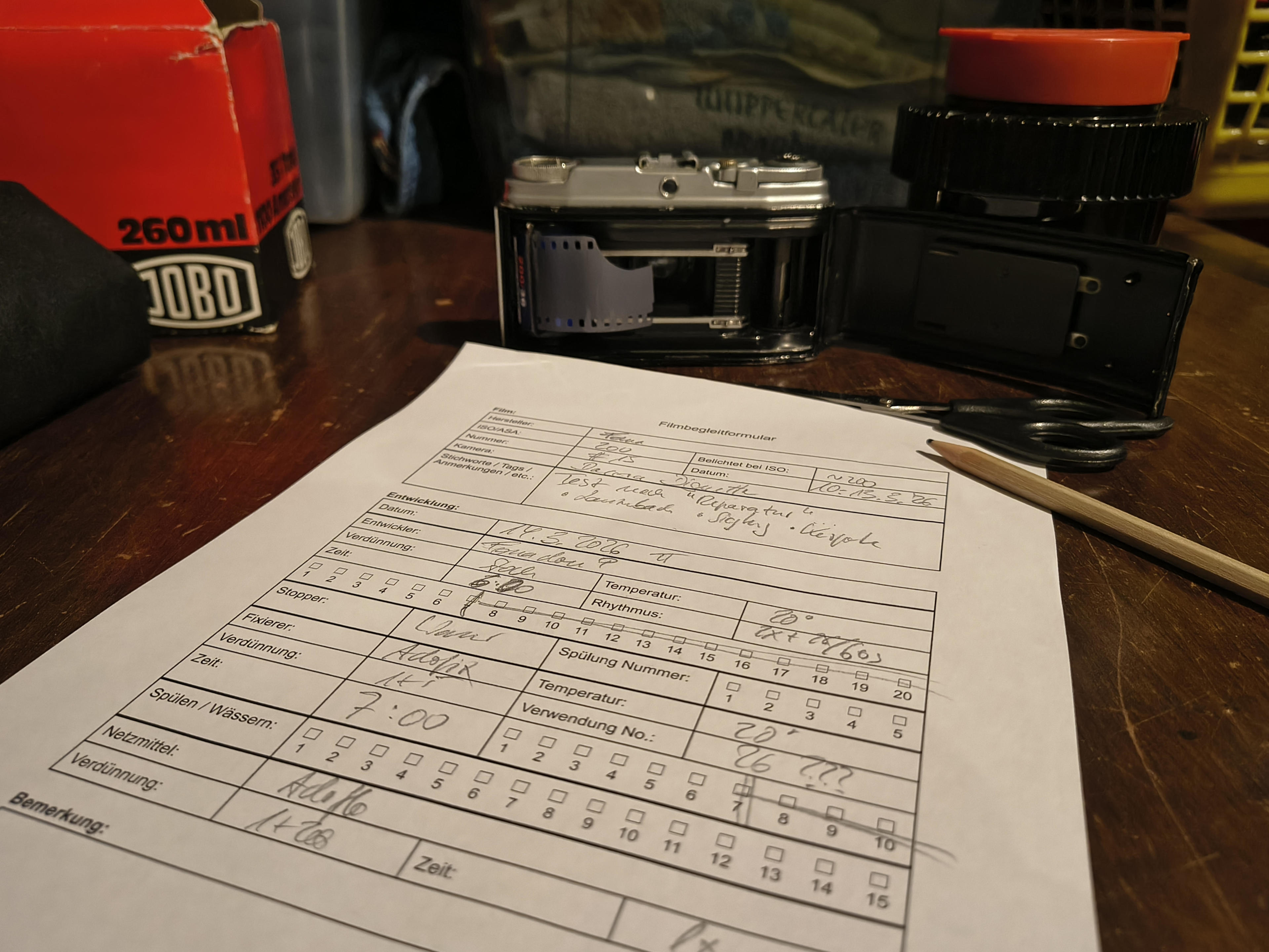 - Entwicklung: Fomadon R09 1+25 11:30 19,5°C; Adofix 1+5 #22 (?) 7:00 19,5°C; Adoflo 1+200 1x