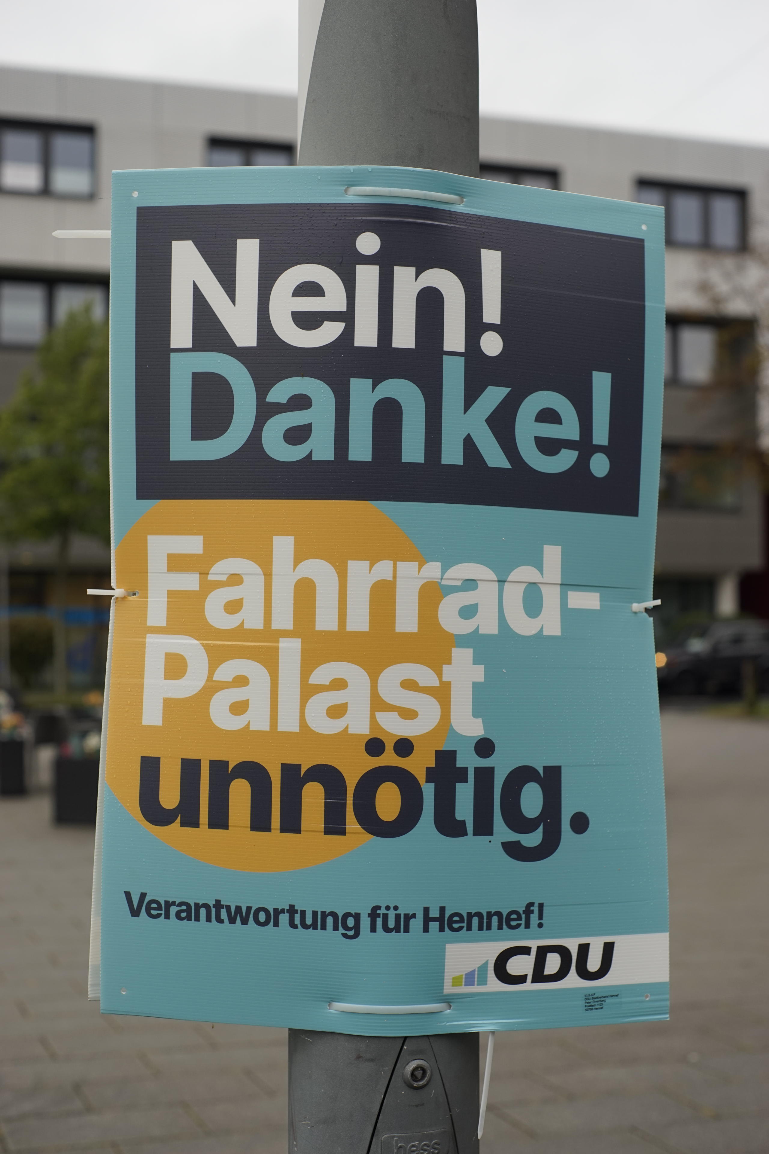 Wie man sieht, es hingen noch die Wahlplakate rum. Die kommunale Stichwahl stand uns in diesem Moment ja noch bevor. Ich hoffe aber inständig, dass die schnell wieder aus dem Stadtbild verschwinden. Mir geht das ja immer unheimlich auf den Zeiger. Wahrscheinlich ist das auch der Grund, weshalb ich die immer im Bild festhalten muss, damit ich den Rest der Zeit weiß, wie gut wr es haben, wenn nicht die ganze Innenstadt zugekleistert ist. Dieses spezielle Plakat habe ich mal mit genommen, weil es sich tatsächlich auf ein konkretes kommunales Thema bezieht, was ja eher eine Seltenheit ist. Wobei ich ja grundsätzlich auf der anderen Seite des politischen Spektrums zu suchen wäre. Trotzdem, man muss auch mal den politischen Gegner loben, dass er sich an Themen versucht, die tatsächlich relevant für diese Wahl waren. Auch wenn ich den Ton nicht unbedingt produktiv finde. Aber das muss ja jeder selber wissen, wie viel Polemik er/sie/es aufs Plakat druckt. ;-)