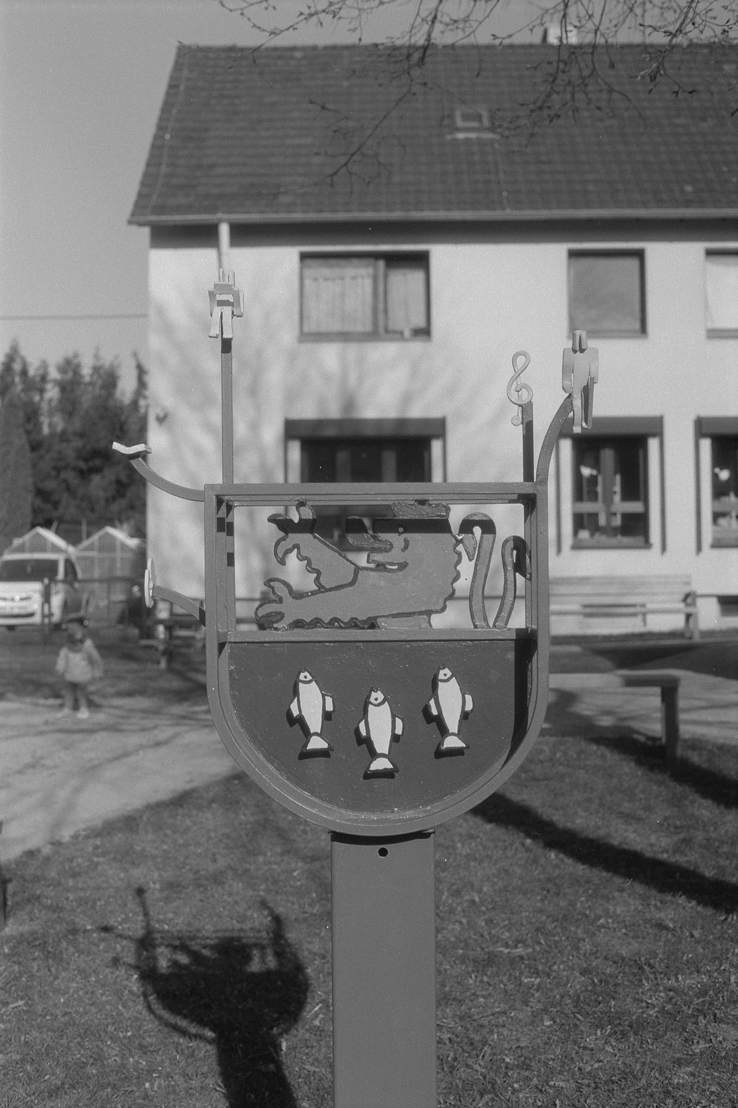 Wie immer war ich erst mal einkaufen im Dorf und habe gegenüber vom Bürgerbüro / der Bibliothek auf dem Discounterparkplatz geparkt. Nachdem ich da mit dem Einkauf fertig war, bin ich für die üblichen Kleinigkeiten ins Dorf gegangen, weil jeder Gang ja bekanntlich schlank macht und habe dort erst mal das Gemeindewappen mitgenommen. (1/1000s, f/4.) Warum ist mir im Hintergrund das Kind ins Bild gelaufen? Ich weiß es nicht. Aber immerhin ist es so unscharf, dass ich es nicht auch noch manuell unkenntlich machen musste. Leider ist das Gebäude im Hintergrund auch eher ablenkend, aber unschärfer bekam ich es bei dem vielen Licht leider nicht.