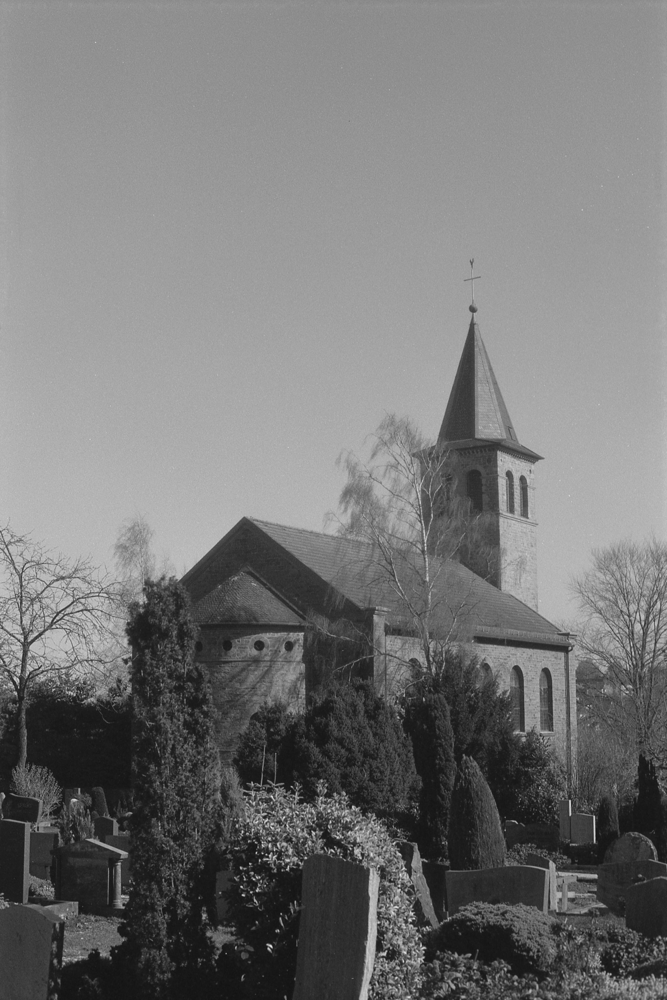 Nach getaner Arbeit habe ich noch ein bisschen auf dem Freidhof weiter gemacht - ja, ich weiß, da bin ich in letzter Zeit ständig, aber man muss ja auch da mal sauber machen und den Winter weg räumen. Die Kirche war mein erster Schnappschuss. (1/500s, f/8.) Es war hell, wie man an den Werten sehen kann. Und ich finde, ich habe die Kirche mal wieder von ihrer Schokoladenseite getroffen. ;-) So weit abgeblendet verhält sich dieses 50er nicht groß anders als all die anderen 50er, die ich habe. Man merkt, es ist ein etwas besseres Nikkor, wenn man es in der Hand hält, aber vom alleinigen Betrachten des Fotos her, könnte ich jetzt nicht sagen, ob es nicht Vielleicht doch die E-Serie war oder das AF. Das AF-S G hingegen hat noch eine Tacken mehr Präzision, das sieht ja selbst auf Film klinisch scharf aus.