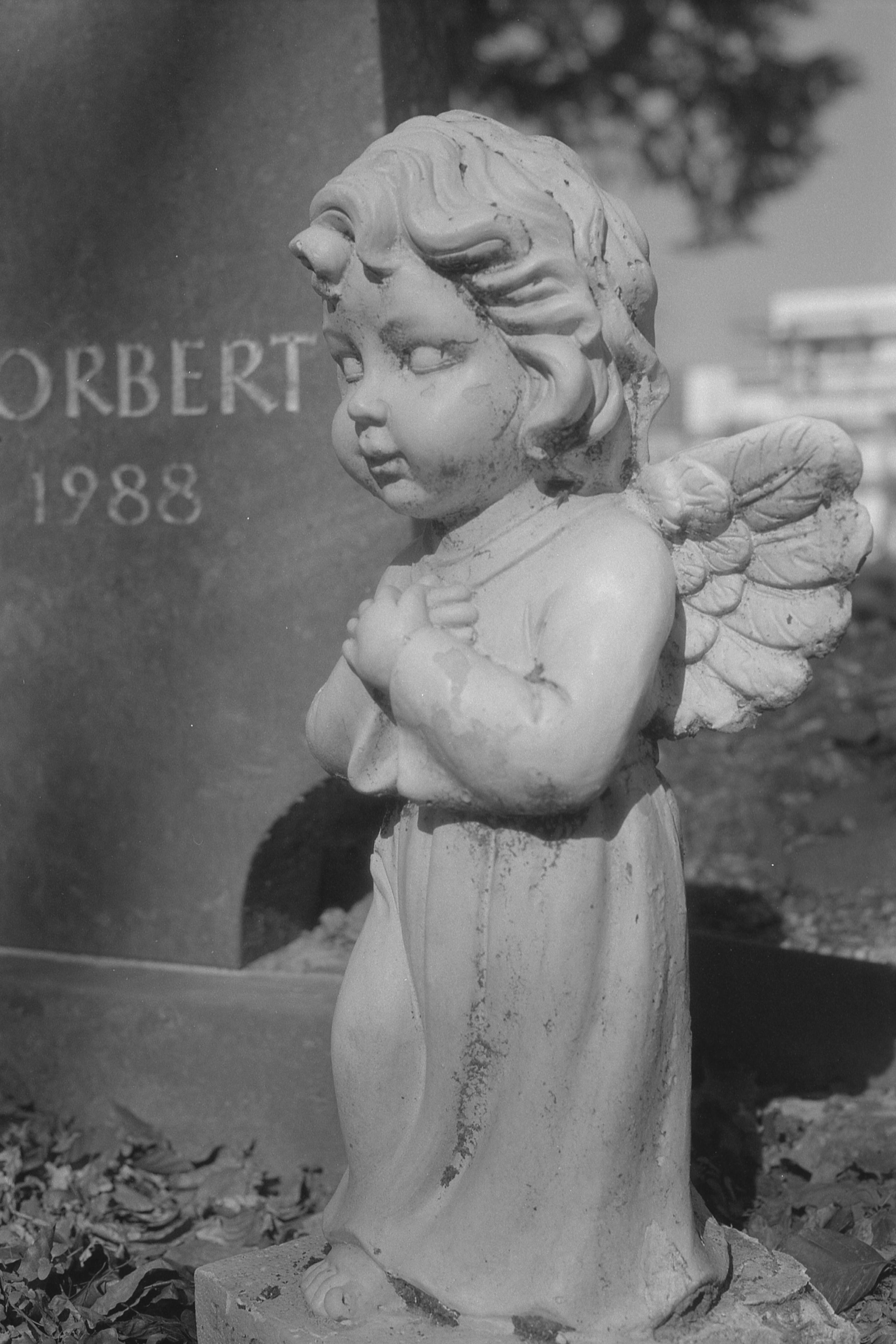 Auch hier habe ich mich nach der Arbeit ein bisschen um die Ecken begeben, Motive suchen, Engelchen finden. (1/1000s, f/5,6.) Schon etwas kitschig, diese Grabengel. Aber bei diesem Licht und mit dem s/w-Film trotzdem spannend. Vor allem, weil man im Hintergrund die Baustelle sehen kann, wo sie auf dem Gelände der ehemaligen Gärtnerei die Gewächshäuser abgerissen haben und jetzt diese Wohnungen hin bauen. (Ich glaube, das sollte betreutes Wohnen werden? Meine ich mich zu erinnern.) Jedenfalls: Foreshadowing! ;-)