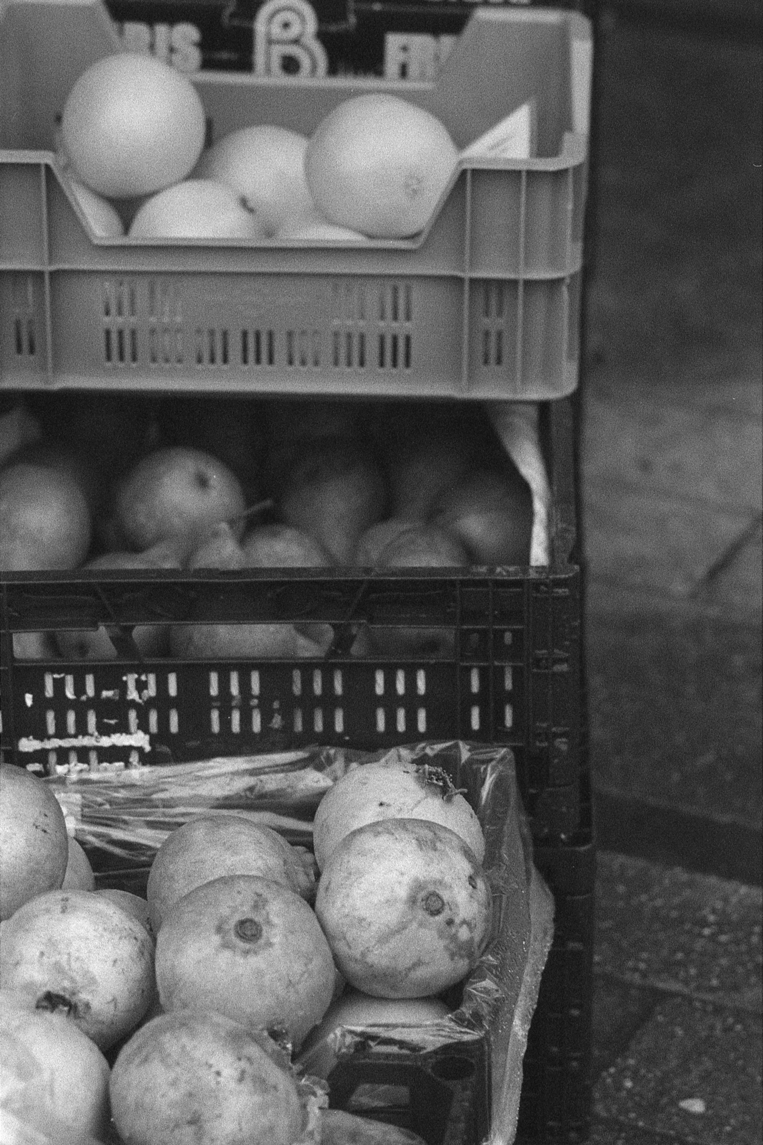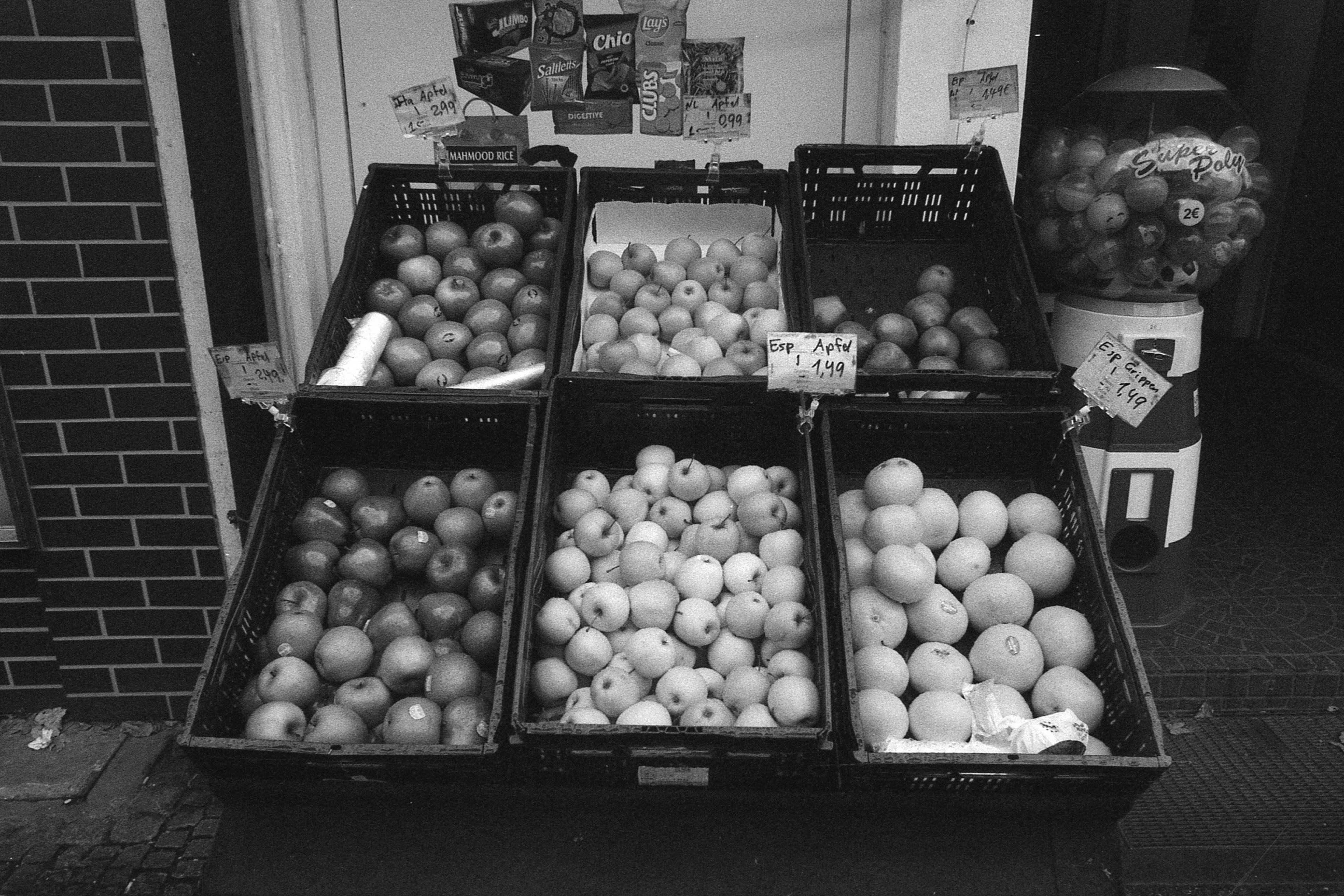 Ich war noch nicht fertig mit den Geschäften hier am anderen Ende von Hennef: Den türkischen Gemischtwarenladen, der jetzt in dem Laden drin ist, wo vorher der Herr B sein Fotogeschäft hatte, musste auch noch dran glauben. (Unbekannte Werte, unbekanntes Objektiv.) Die Äpfel sehen richtig appetitlich aus. Krieg ich direkt Hunger, obwohl die nur s/w sind. Sind das unten links Apfelsinen oder kleine Pampelmusen? "Grippen" sagt mir nix und ohne Farbe kann ich es dann doch nicht erkennen. 1,49 jedenfalls.
