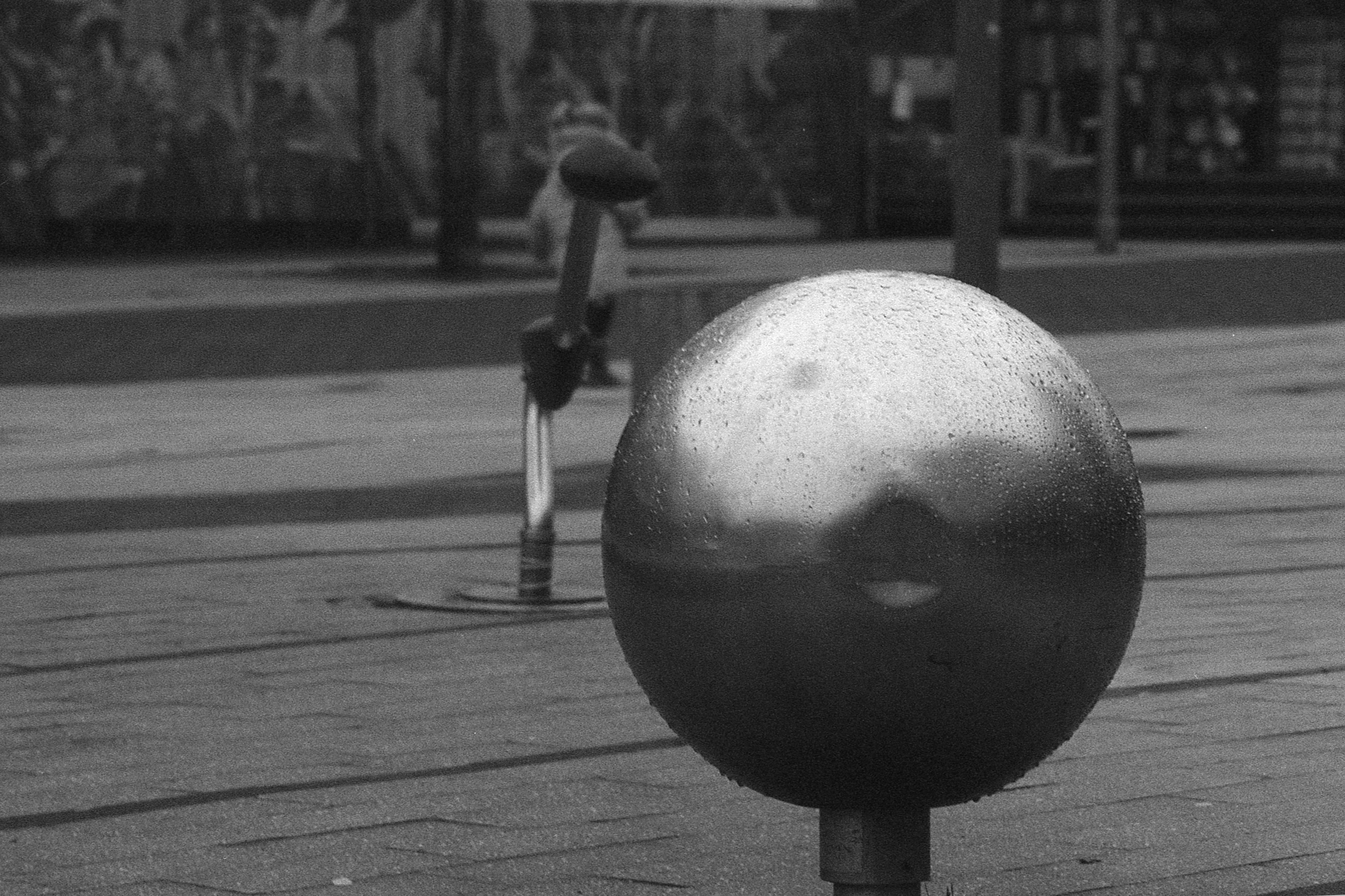 Auf dem Markt selber stehen da noch diese silbernen Kugeln rum, die im Regen ganz nass geworden waren. (1/160s, f/11, 135mm.) Hatte hier die Blende ebenfalls sehr weit geschlossen, um das Schaukelspielzeug im Hintergrund schärfer zu bekommen und habe dabei gar nicht gemerkt, dass mir ein Blag ins Bild gelaufen war. Bei Komposition mit Offenblendenmessung war das so unscharf, dass ich das nicht wahtgenommen habe. Merken: Immer wichtig, auch mal die Abblendtaste zu verwenden. Die hat ja jedes Olympus-Objektiv!