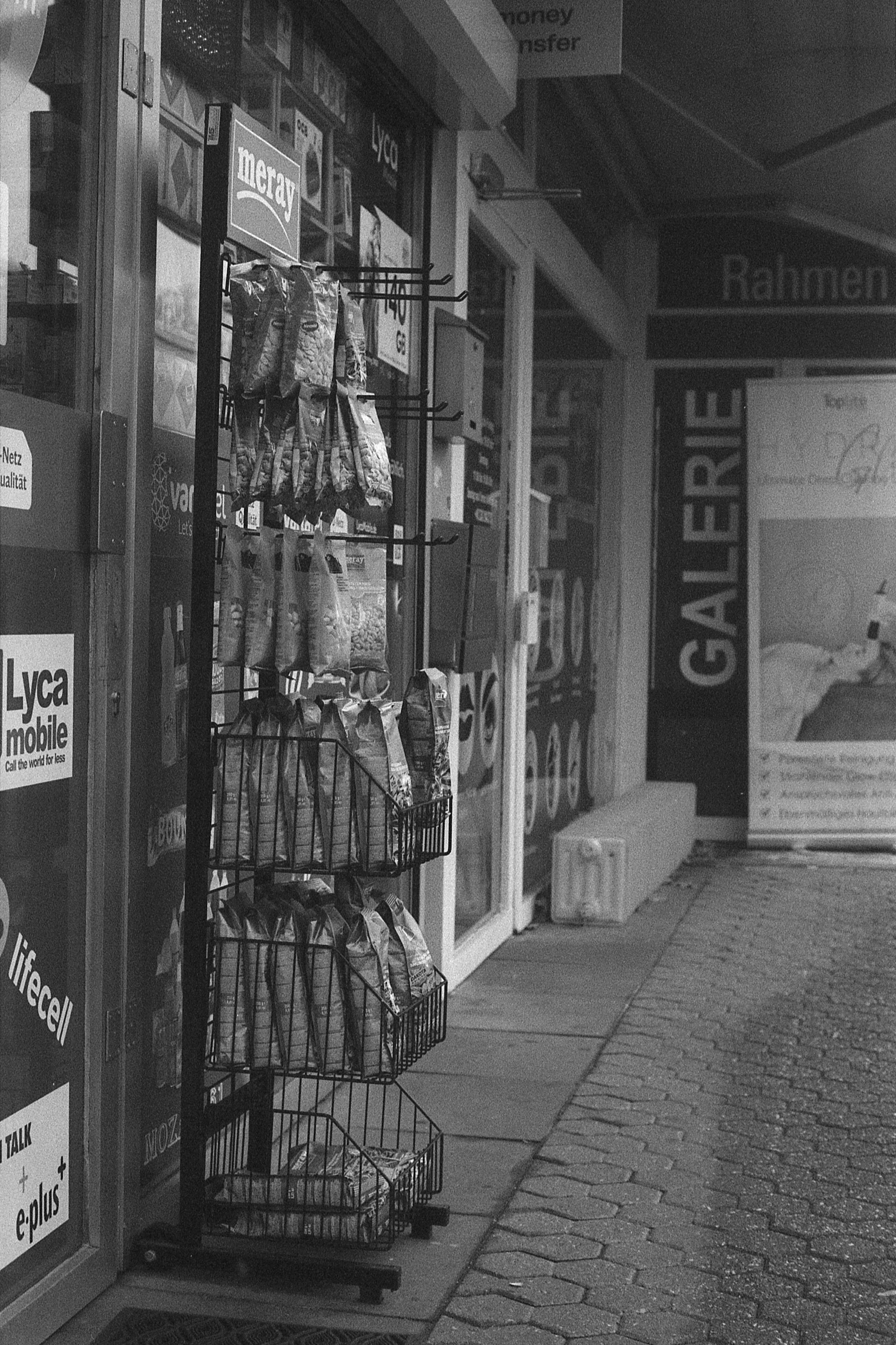 Beim Telefon-SIM-Karten-Anbieter gab es dann noch Nüssen und Gedöns, die habe ich auch mal s/w gemacht. (1/250s, f/5,6, 50mm.) Einfach, weil ich dachte, das gibt mit dem Fluchtpunkt in der Sackgasse (so sieht es aus, obwohl es nicht stimmt) ganz interessant aus. Und ansonsten einfach, weil ich den Film ja voll kriegen will!