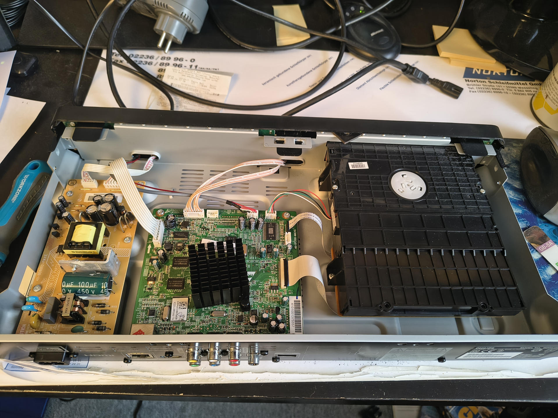 Natürlich geht nach (n+1) Jahren die Schublade nicht mehr auf. Ich vermutete, wie man das so tut, das Gummiband der Schublade. Weil, die leiern ja immer aus. Noch kein Gerät gesehen, bei dem der Riemen nicht früher oder später schlaff in der Gegend rum hängt oder - noch schlimmer - zu matschigem Schlodder degradiert ist. Keine Ahnung, was in dem Gummi drin ist, dass sich das immer so verflüssigt. Der Motor lief jedenfalls und machte brummelige Geräusche.