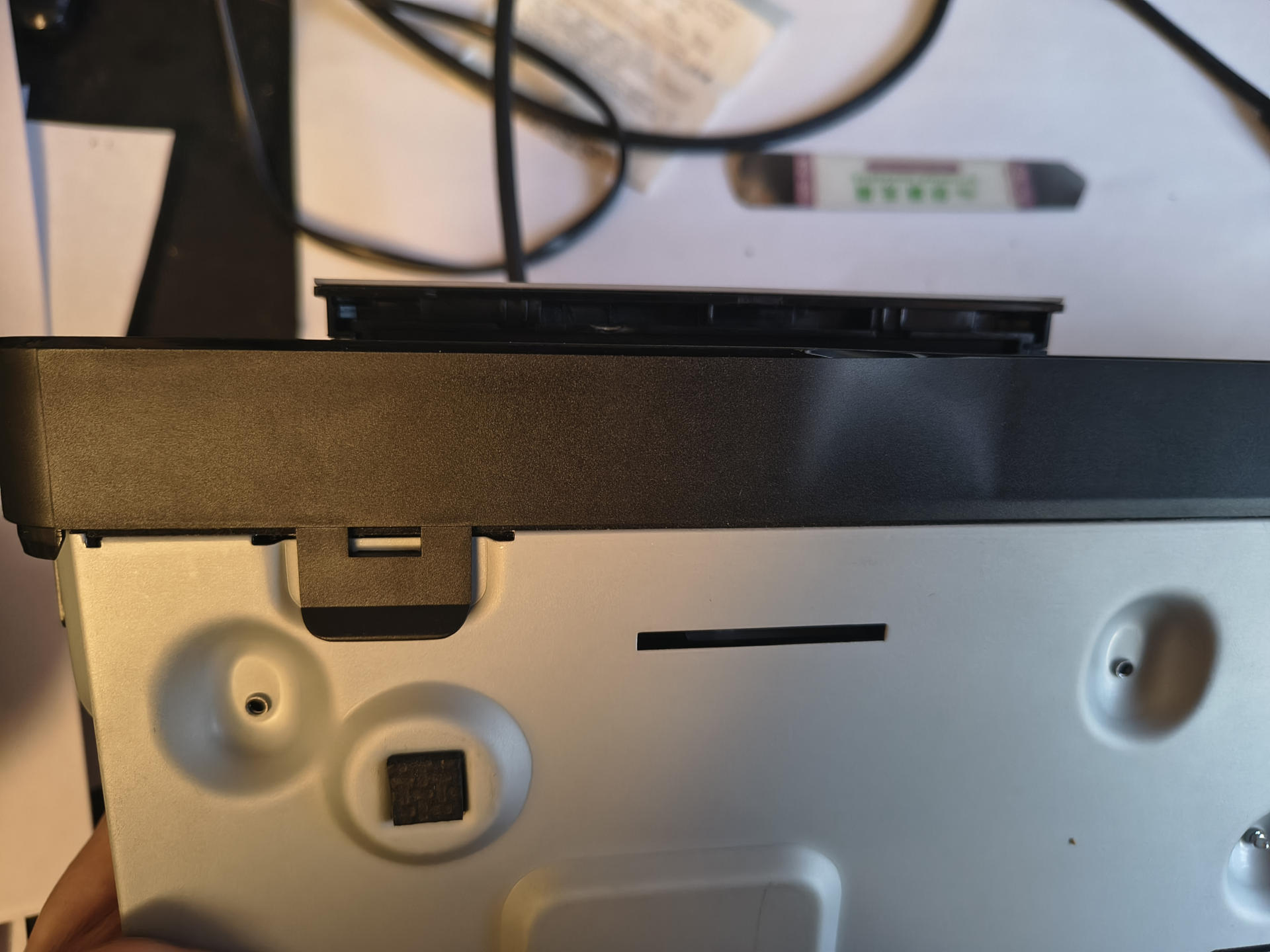 Jedenfalls habe ich diesen Notauswurf dann mal betätigt und zack, kam auch die Schublade raus. Es scheint, dass die Zierleiste am Laufwerk sich im Gehäuseplastik verhakt gehabt und dadurch, dass ich das Laufwerk schon halb demontiert hatte, hatte sich das gelöst. Ich nehme an, dass sich das Plastik mit den Jahren anders ausgedehnt hat oder irgendwas anderes geschrumpft ist. Ich hab sie jetzt jedenfalls ab gemacht. Ist der gleiche Clip-Mechanismus wie an einem PC-Laufwerk. (Wahrscheinlich, wenn ich es weiter auseinander genommen hätte, hätte ich bestimmt herausgefunden, dass das auch einfach ein PC-Laufwerk ist. Stink normales SATA, gehe ich mal von aus, nur mit einem seltsamen Kabel-Gemüse dran. Aber nagelt mich nicht drauf fest. Dafür hätte ich mal unter die unten am Laufwerk angenagelten Zusatzplatine gucken müssen, die wohl für die Übersetzung zuständig ist.