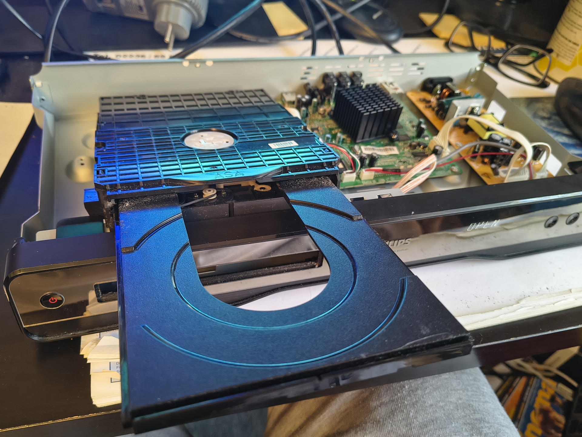 Nachdem ich jedenfalls die Zierleiste von der Schublade abgeclippt hatte, ging das Laufwerk wieder einwandfrei auf und zu. Ich lass die jetzt also erst mal ab, auch auf die Gefahr hin, dass dann mehr Staub in das Gerät eindringt. Die schließt nämlich tatsächlich sehr dicht und fest ab, was ich so nicht gedacht hätte. Aber da es in dem Gehäuse selbst sehr sauber und unstaubig aussieht, da das Ding ja normalerweise in einem verschlossenen Schrank steht, der nur im Betrieb geöffnet wird, wegen der Belüftung, gehe ich dieses Risiko mal ein.