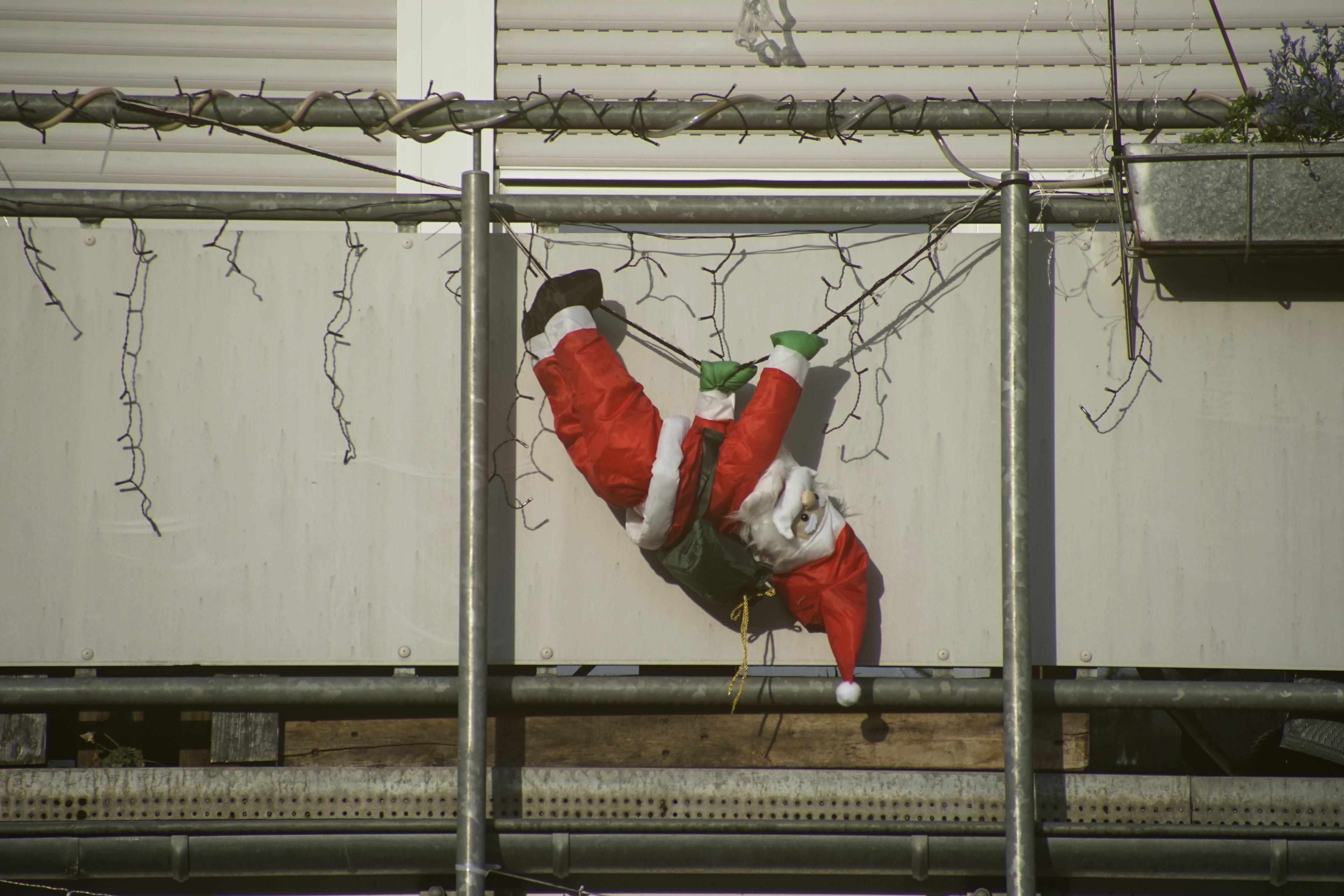 Der Stern da oben kommt ganz gut, auf die kurze Entfernung und mit der passenden Unschärfe der Balkone, die sich nach oben immer mehr verstärkt, finde ich gut. Auch das Schaf im Schaufenster hat was. Aber den Vogel abschießen tun mal wieder die Weihnachtsmänner, die hier in so manche Obergeschosswohnung einzubrechen versuchen.