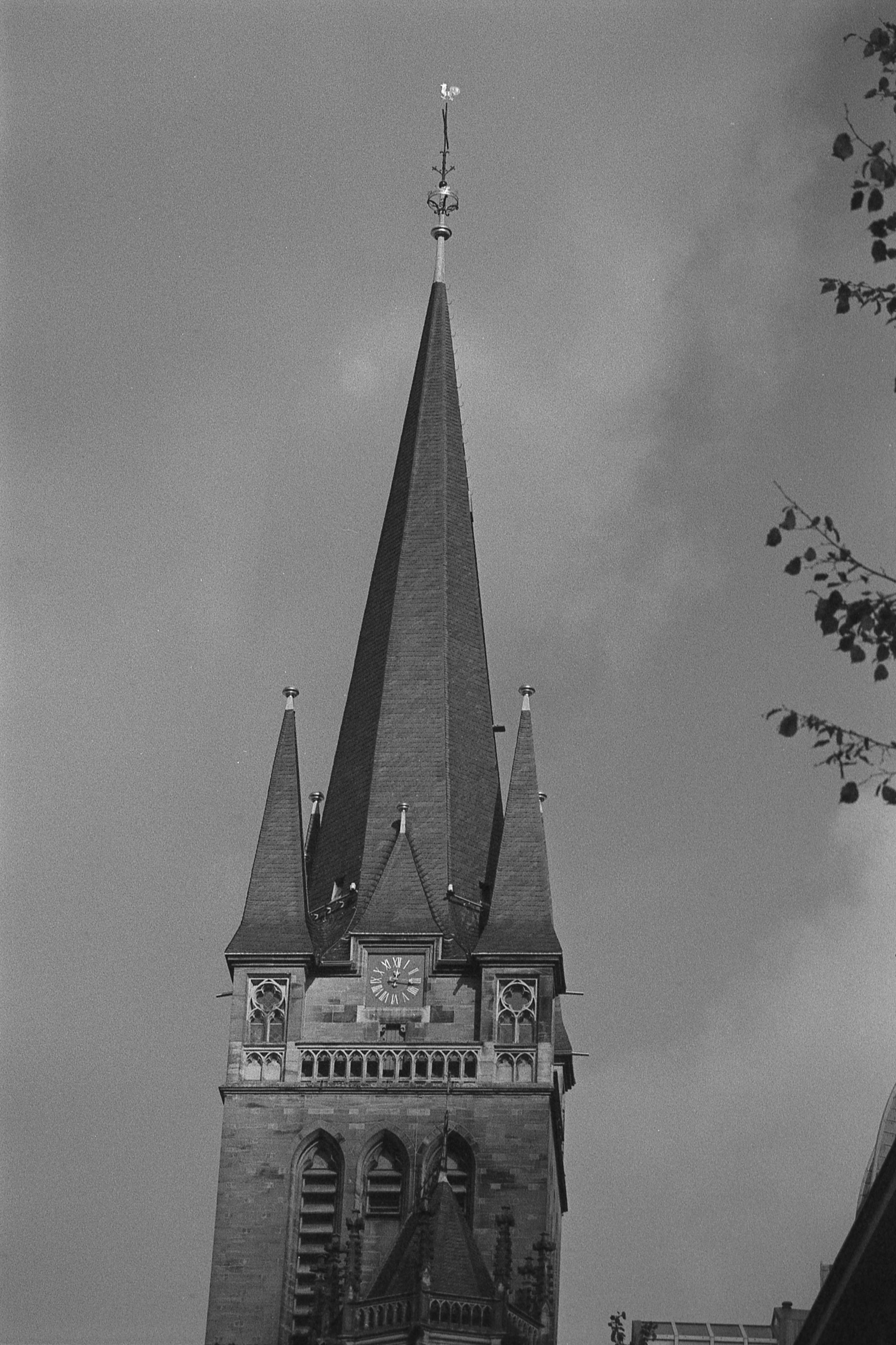 Den gleichen Turm habe ich danach noch durch die Häuserschlucht direkt davor mit genommen, um ihm ein wenig Kontext zu verpassen; hier allerdings mit dem 50er, weil wir uns schon so sehr genähert hatten. (50mm, 1/6000s, f/2,8.) Tja, da war selbst die Kamera zu langsam für den schnellen 400er Film, sonst hätte ich die Blende ganz geöffnet, um die Gebäude im Vordergrund richtig unscharf zu bekommen. Aber es geht auch so ganz gut. Es war halt doch heller als erwartet. Ich merke das immer wieder, dass ich im Herbst zu schnelle Filme einlege, weil ich denke: Kackwetter! Und dann scheint doch die Sonne wie verrückt!
