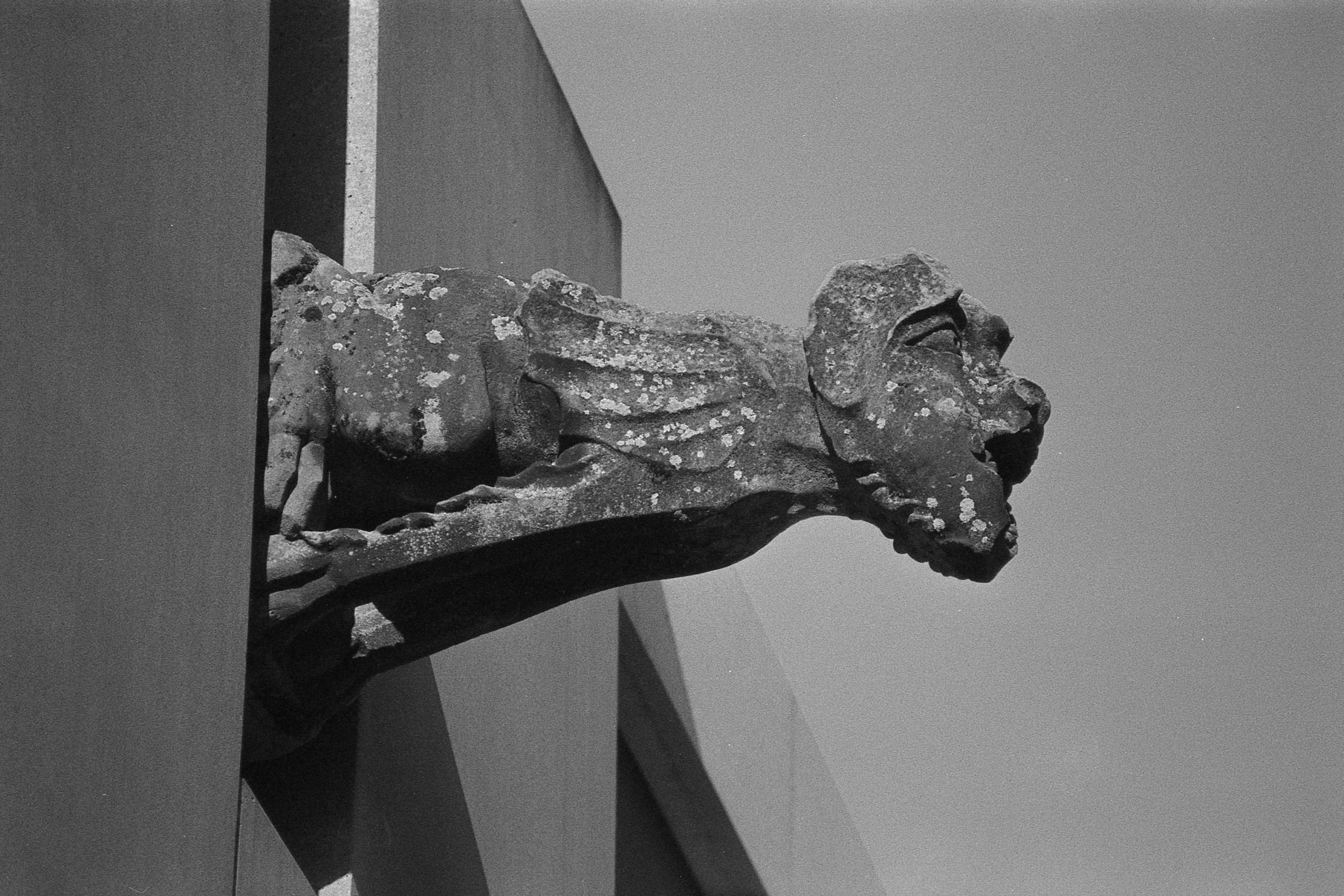 Und dann noch ein alter Wasserspeier, eingebettet in eine moderne Betonkonstruktion. (100-200mm @ ~175mm, 1/1500s, f/4,5.) Auch noch ein Bild, zu dem ich wenig sagen muss, weil es mir einfach sofort gefällt: Der Kontrast zwischen alt und neu, die Flechten in seinem Gesicht, der Schattenwurf im Hintergrund: Alles gut!
