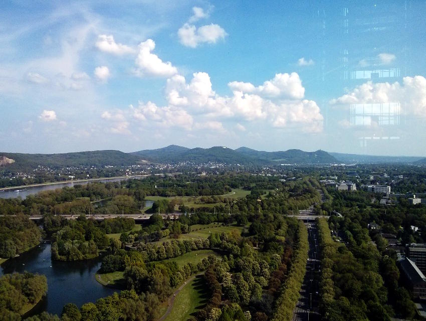 Von oben - bzw der 30sten Etage, ganz nach oben darf nur der Vorstand - merkt man erst mal, wie hoch der Tower über den Rest Bonns hinaus ragt. Die Sicht ist auch sehr gut gewesen, sodass man sowohl den Blick auf den Kölner Dom (im Foto leider zu klein) als auch das Siebengebirge richtig genießen konnte.