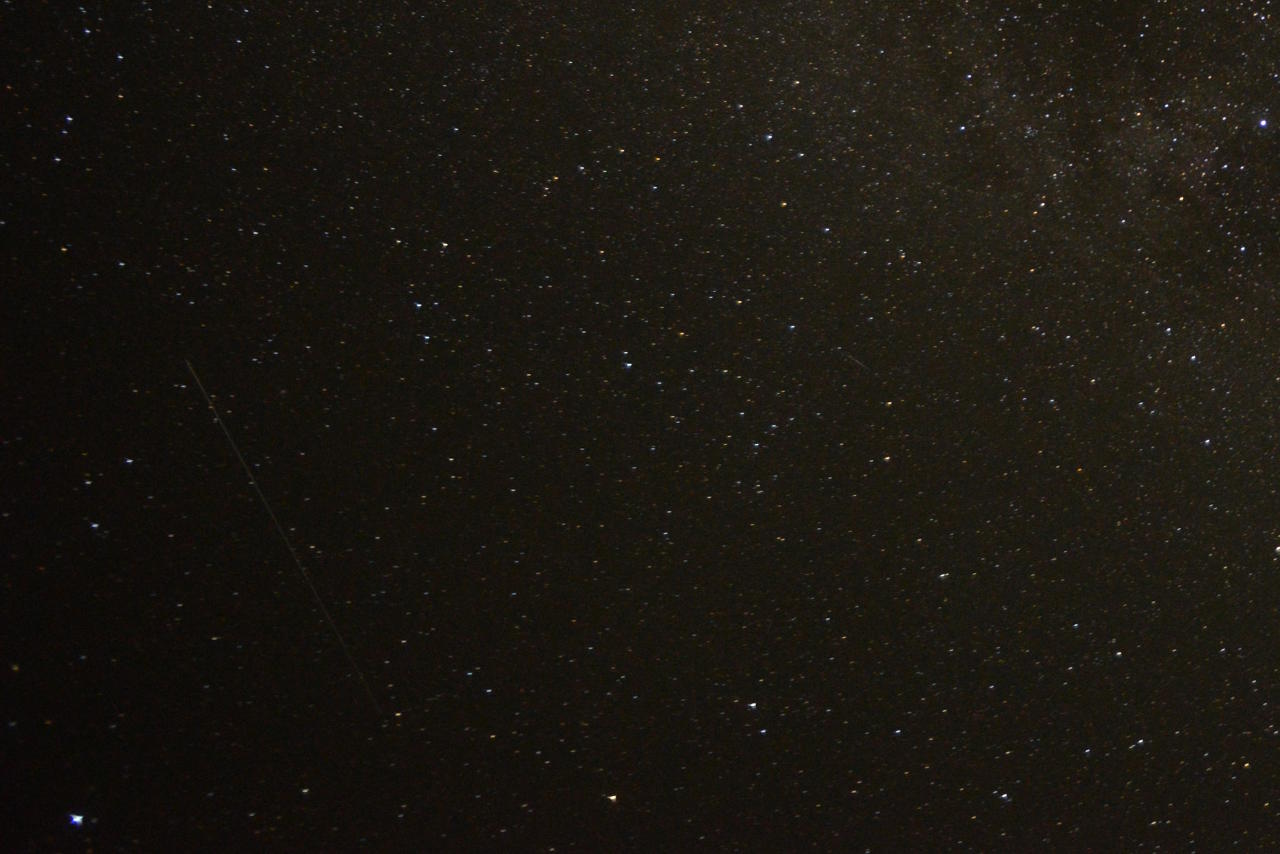 Nachts dann, als es kalt wurde und der Dunst aus der Atmosphäre raus war, dann diese recht spektakulären Bilder der Milchstraße gemacht. Einfach die Kamera mit dem Weitwinkel auf den Gartentisch gelegt und 30 Sekunden belichtet. (Unten ist Süden.) Dabei zufällig ein paar Sternschnuppen erwischt. (Erstes Bild, linker Rand.)