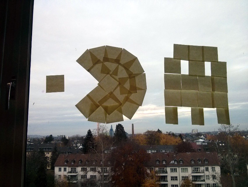 Ich möchte dazu erwähnen, dass einer der Chefs rein kam und zum zweiten Mal gefragt hat, warum denn noch kein PacMan am Fenster kleben würde, wo wir doch schon seit einer Woche die neuen PostIt™s herum liegen hätten. Wenn das mal keine Aufforderung war!