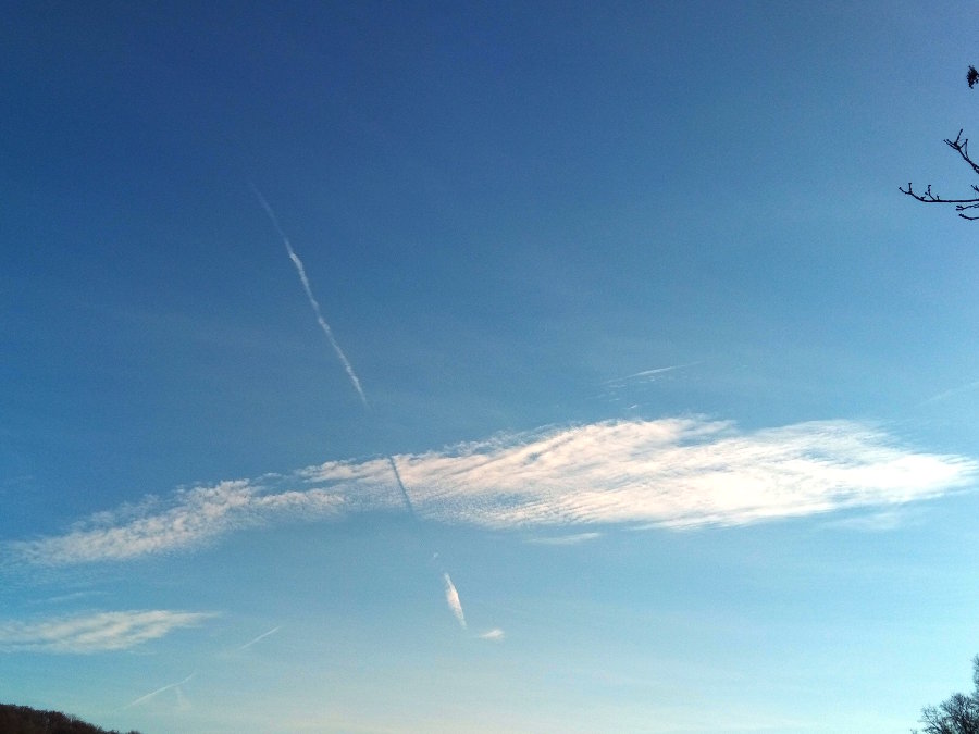 Da war dann noch auf dem Rückweg dieser Kormoran, der im Baum saß und vor sich hin fröstelte. Und außerdem kurz vor der Heimat dieser Schatten auf dem Kondensstreifen, den ich auch ganz witzig fand, weil es so scheint, als wäre die Wolke darüber in zwei Stücke zerschnitten.