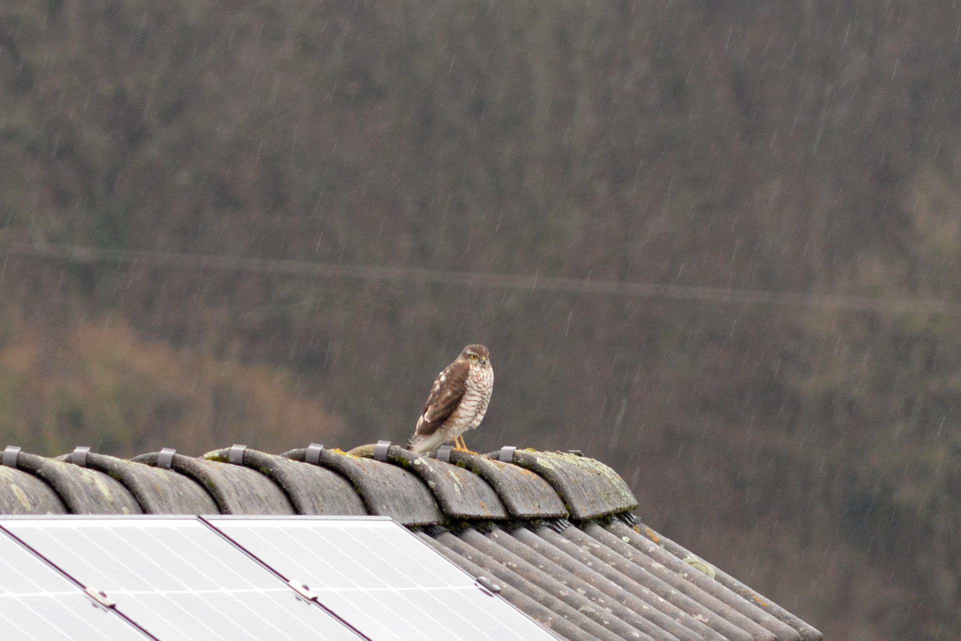 War eigentlich am Kühlschrank, um die Nahrungsmittelzubereitung für heute Abend zu planen, da sehe ich das Tier direkt gegenüber bei den Nachbarn auf dem Dachfirst sitzen, und /*zack/*, hatte ich ihn schon im Kasten, den Vogel. Ganz praktisch, so einen Vogel im Kasten zu haben, dann kann ich demnächst, wenn ich wieder Menschen fotografieren sollte, sagen, dass das Vögelchen gleich kommt!