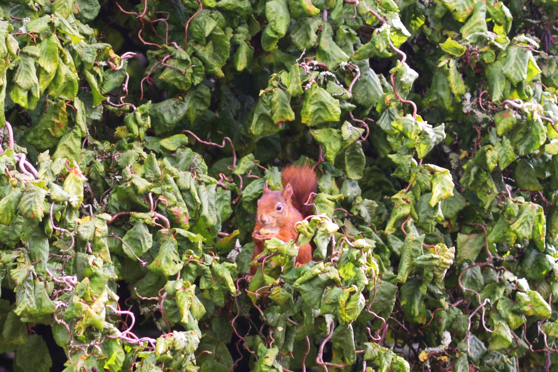 Jajaja, schon wieder das Eichhörnchen im Garten bei der Mutter! Aber ich könnte einfach stunden- bis tagelang zuschauen, wenn das über die Wiese huscht und seine Nüsse versteckt! Oder den Korkenzieher-Hasel rauf und runter rennt. (Wenn man dem Baum zu nah kommt, dann kann man übrigens am Knabbern hören, wo das Hörnchen gerade sitzt und eine Nuss mit seinen scharfen Zähnen aufmeißelt.)