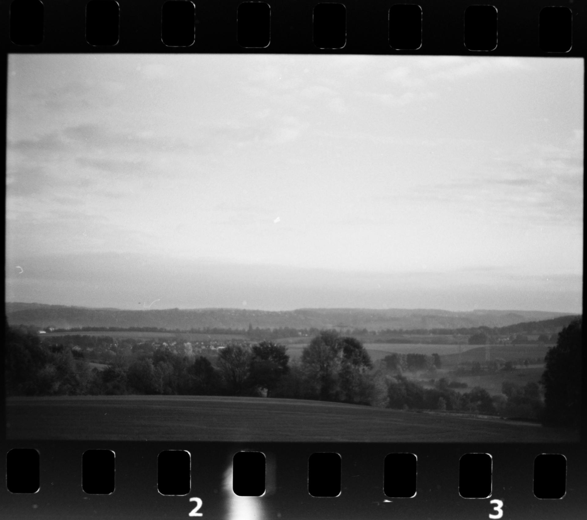 Es handelt sich hier um die ersten drei Bilder des Films "Fomapan #10", den ich vor zwei, drei Wochen mit der F601 verschossen habe. Ein Blatt auf der Straße, schwierig abzufotografieren, da nur ein ganz kleiner Bereich in focus ist; ein Blick über das Hanfbachtal, wieder etwas schwieriger, weil der Himmel wenig Struktur bietet; und die Höhenstraße mit Bäumen und Blättern und Gegenlicht, relativ gut scharf zu kriegen, da viele kleine Details. Bei allen drei Bildern habe ich den Zoom des Live-View benutzt, um die maximale Schärfe raus zu bekommen. Mit viel Nachbearbeitung sieht das Resultat dann am Ende so aus: