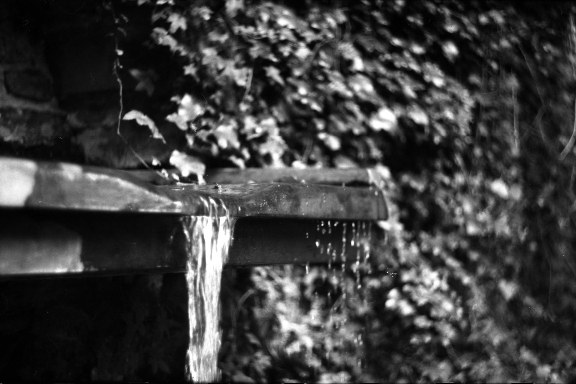 Von der anderen Seite habe ich allerdings praktisch gar keinen Swirl hin bekommen. (Helios 44, f/2, 1/60s.) Dafür habe ich hier schön scharfes Wasser und etwas mehr drum herum: Mauer, Farn und Efeu machen sich echt gut. Mit einem empfindlicheren Film hätte ich hier vielleicht tatsächlich mal die Blende weiter zu gedreht, denn ich glaube fast, ein scharfer Hintergrund wäre hier gar nicht so falsch gewesen.