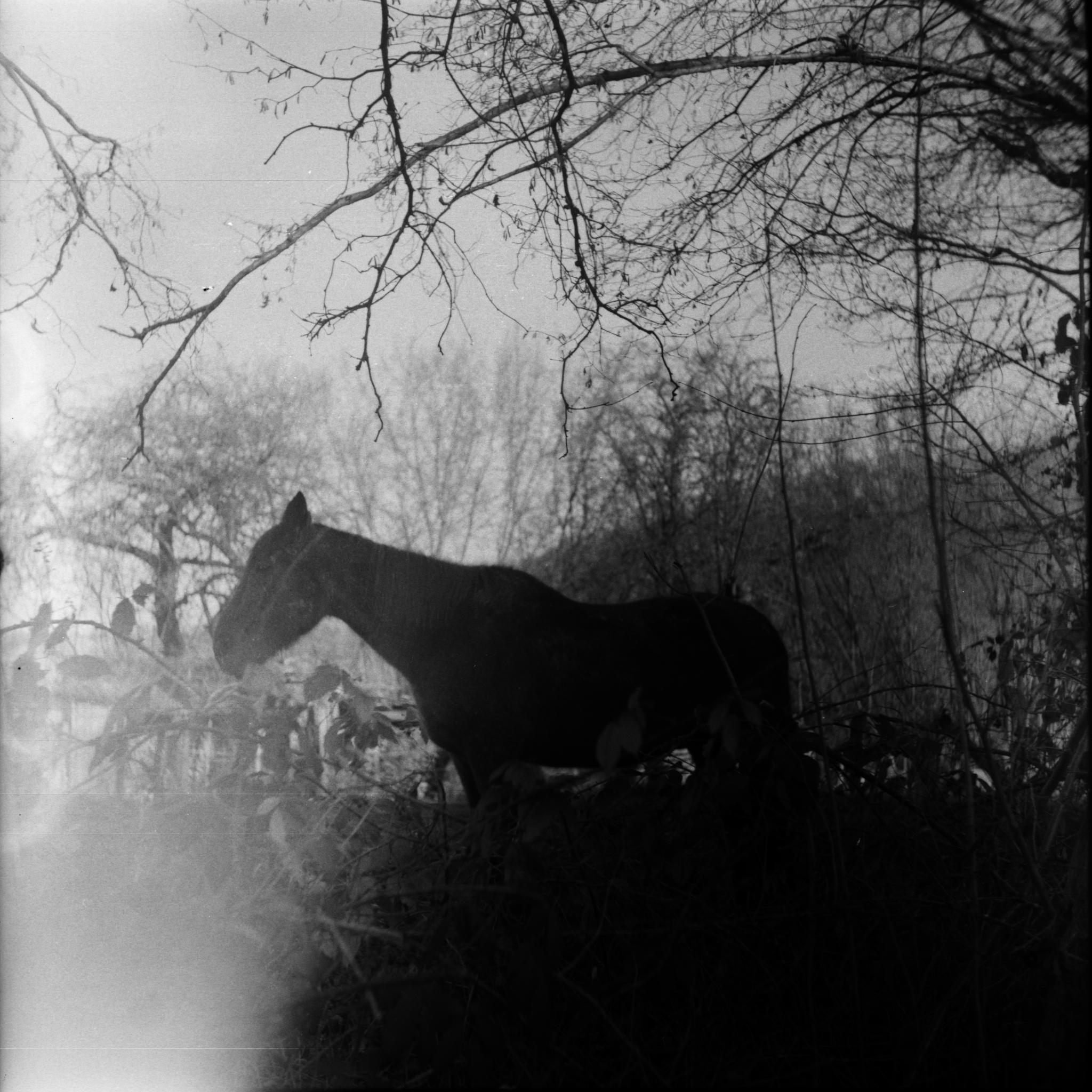 Das erste Bild auf dem Film zeigt mal wieder meine lieben Schmuddelpferde. (1/100s, f/8.) Natürlich sind das nicht meine im engeren Sinne, sondern mehr so liebgewordene, alte Bekannte. Normalerweise kommen sie schon immer ans Tor, wenn sie mich sehen, aber heute nicht. Das macht aber nicht viel, denn die Auflösung vom Film ist so hoch, ich könnte die in der Mitte ausschneiden und hätte noch immer mehr "Pixel" (Silber) als bei einem 35mm Film. Mache ich jetzt aber nicht, weil mir das Bild so eigentlich ganz gut gefällt: Die Pferde in der Mitte, eingerahmt von Bäumen, die Fahrzeugspuren auf der Wiese, der weite Himmel darüber. Etwas schief ist es allerdings auch, und es könnte etwas schärfer sein. 15m hatte ich eingestellt, die Tiere waren aber wohl doch etwas weiter weg.